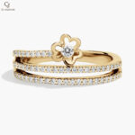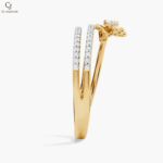 Playful and radiant, this yellow gold ring features a delicate floral motif crowned with a brilliant round diamond. Pavé-set diamonds along the split band add layers of sparkle and dimension. Feminine and charming, it’s a sweet statement piece that shines with every movement.