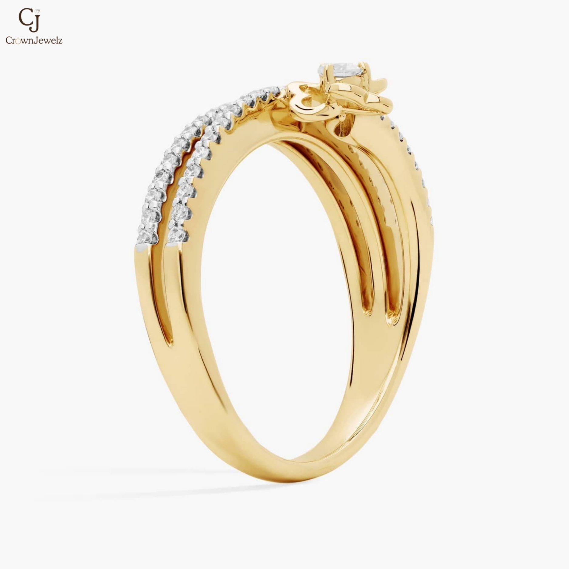 Playful and radiant, this yellow gold ring features a delicate floral motif crowned with a brilliant round diamond. Pavé-set diamonds along the split band add layers of sparkle and dimension. Feminine and charming, it’s a sweet statement piece that shines with every movement.