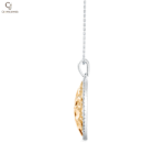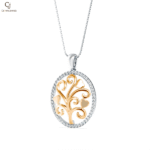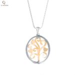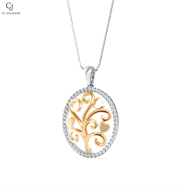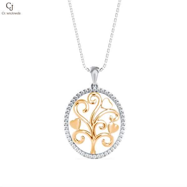 Aurelia Heart Tree Pendant combines romance and symbolism with a golden tree adorned with delicate heart-shaped leaves, set inside a sleek silver-tone oval frame. The contrast of metals and flowing scrollwork creates a striking yet graceful look. This pendant celebrates love, connection, and the beauty of growing together.