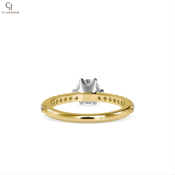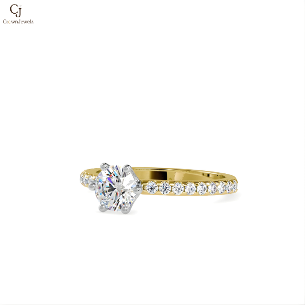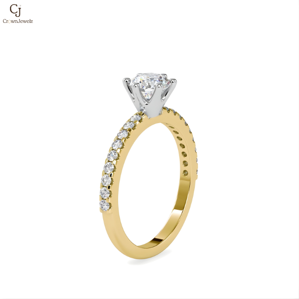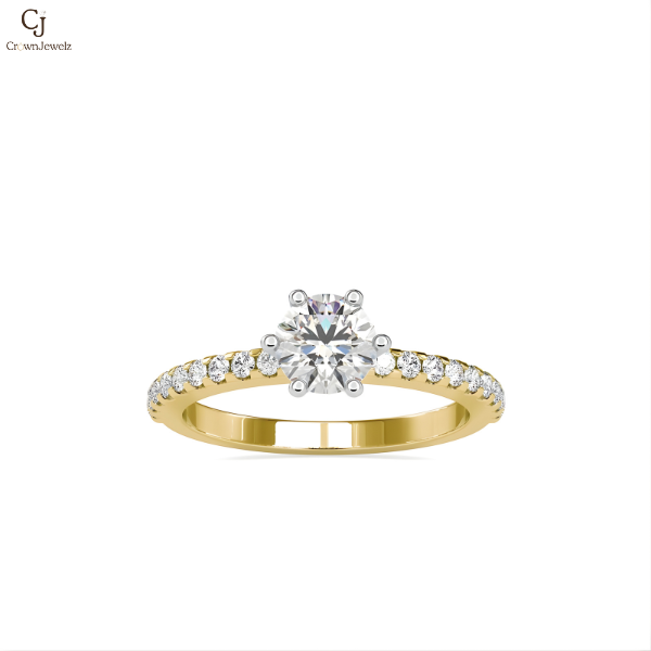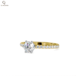Gracefully designed to capture light from every angle, this ring showcases a radiant round-cut diamond elevated in a sleek four-prong setting. The rose gold band is delicately lined with pavé diamonds, creating a soft shimmer that enhances the brilliance of the center stone without overpowering it. A refined balance of warmth and sparkle, this design is ideal for those who appreciate understated luxury with a contemporary edge.