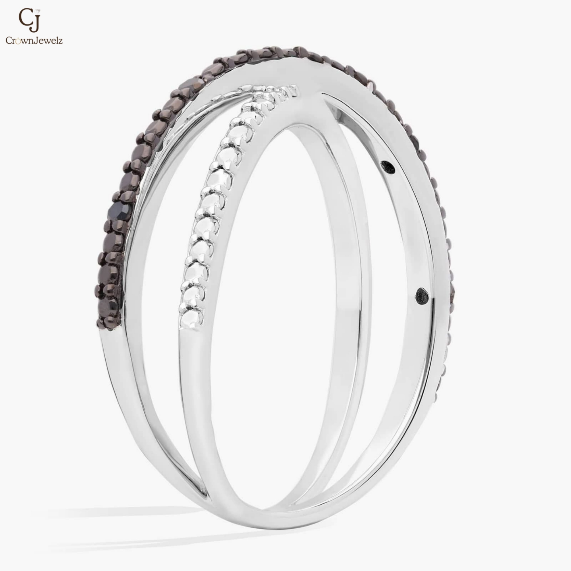 Bold contrast meets modern elegance in this striking crisscross ring design. Crafted in radiant white gold, it features intertwining bands adorned with shimmering white and deep black diamonds. The open silhouette creates a contemporary, airy feel with captivating sparkle from every angle. A statement piece that perfectly balances edge and sophistication.