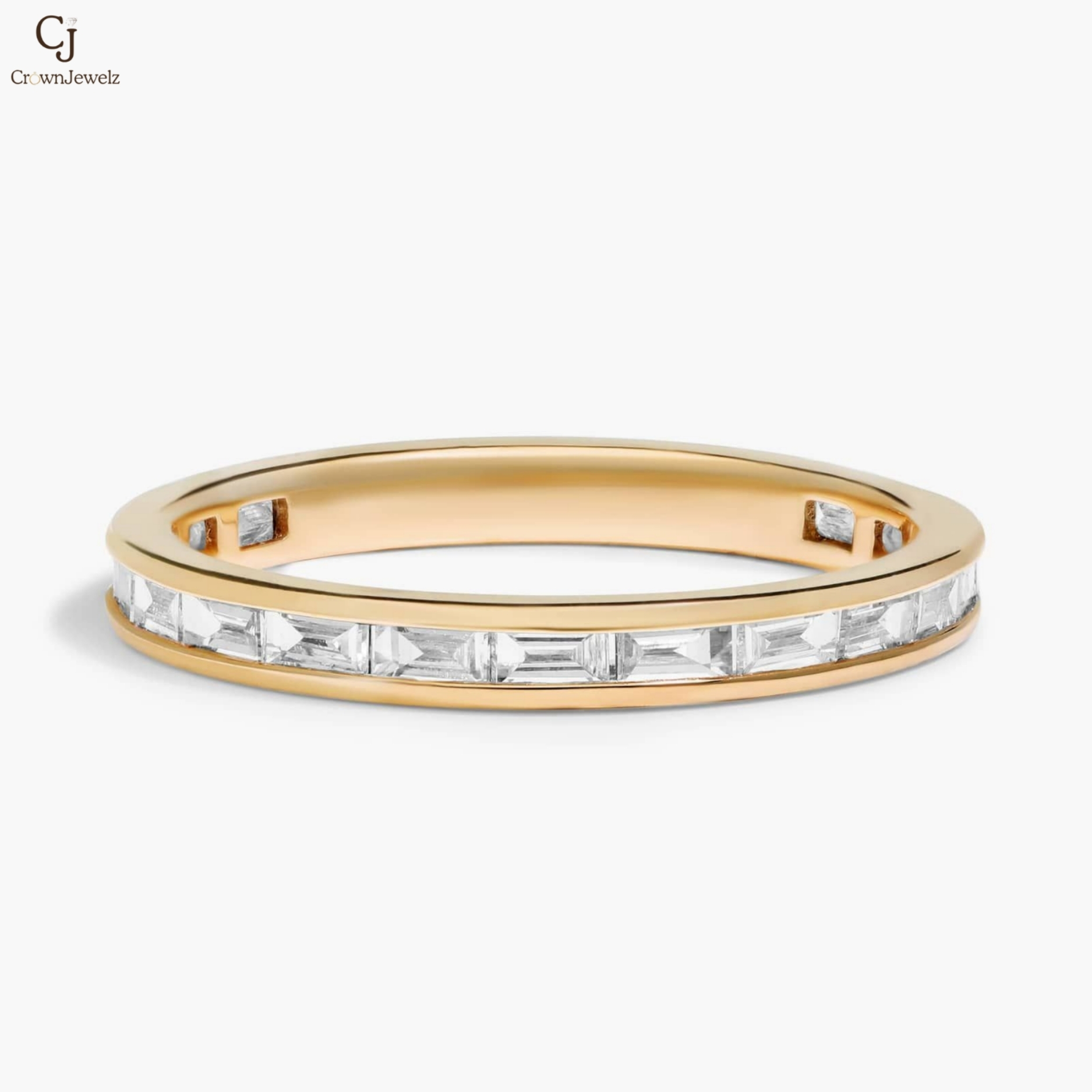 Modern and refined, this sleek gold band features a seamless channel of baguette-cut diamonds for a clean, architectural sparkle. The structured silhouette offers understated elegance with a contemporary edge. Designed for effortless sophistication, it shines beautifully on its own or stacked. A timeless expression of minimal luxury and precision craftsmanship.