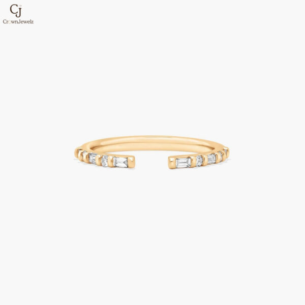 Sleek and contemporary, this open gold ring is adorned with delicate baguette and round diamonds on each end for a refined sparkle. Its minimalist silhouette wraps the finger with effortless elegance. Perfect for stacking or wearing solo, it’s a modern statement of understated luxury.