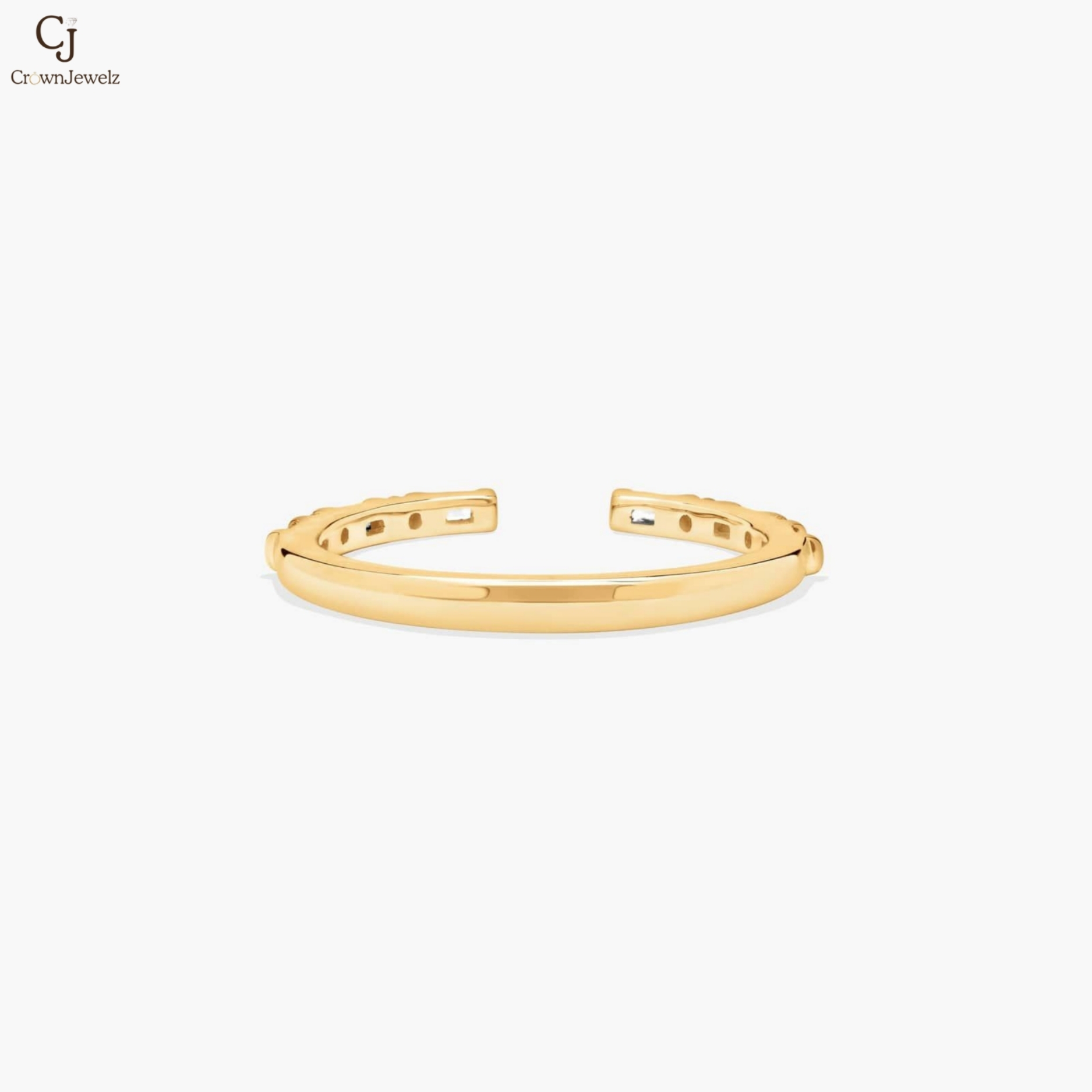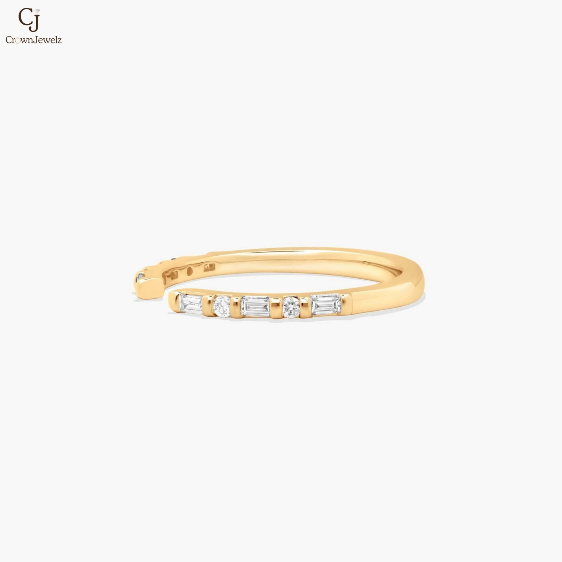 Sleek and contemporary, this open gold ring is adorned with delicate baguette and round diamonds on each end for a refined sparkle. Its minimalist silhouette wraps the finger with effortless elegance. Perfect for stacking or wearing solo, it’s a modern statement of understated luxury.