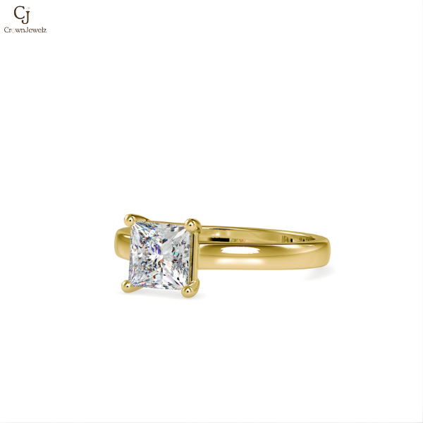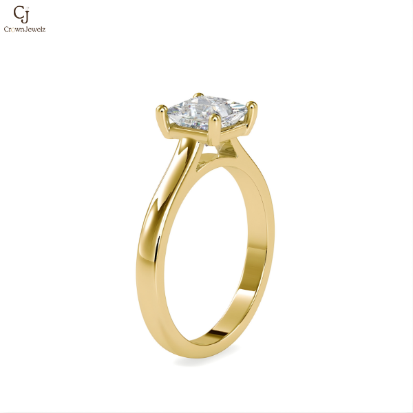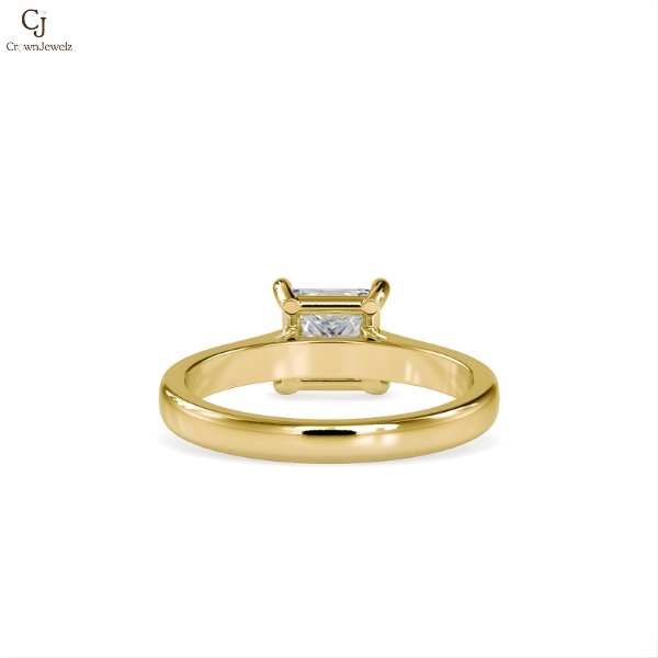 This elegant solitaire ring features a stunning emerald-cut center stone set in a sleek four-prong setting. Crafted in polished yellow gold, the band has a smooth, rounded profile that enhances comfort and timeless appeal. The elevated setting allows light to pass through the stone, maximizing brilliance while maintaining a refined, minimalist silhouette. Perfect for those who appreciate classic design with a modern edge.
