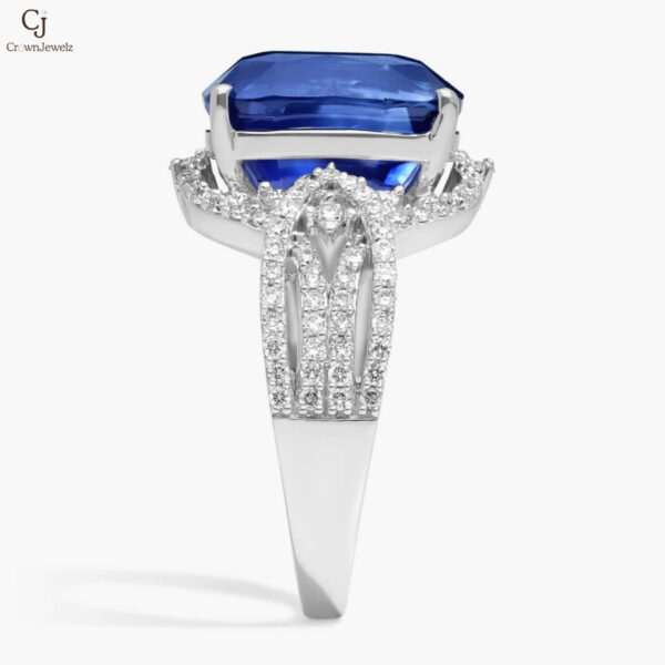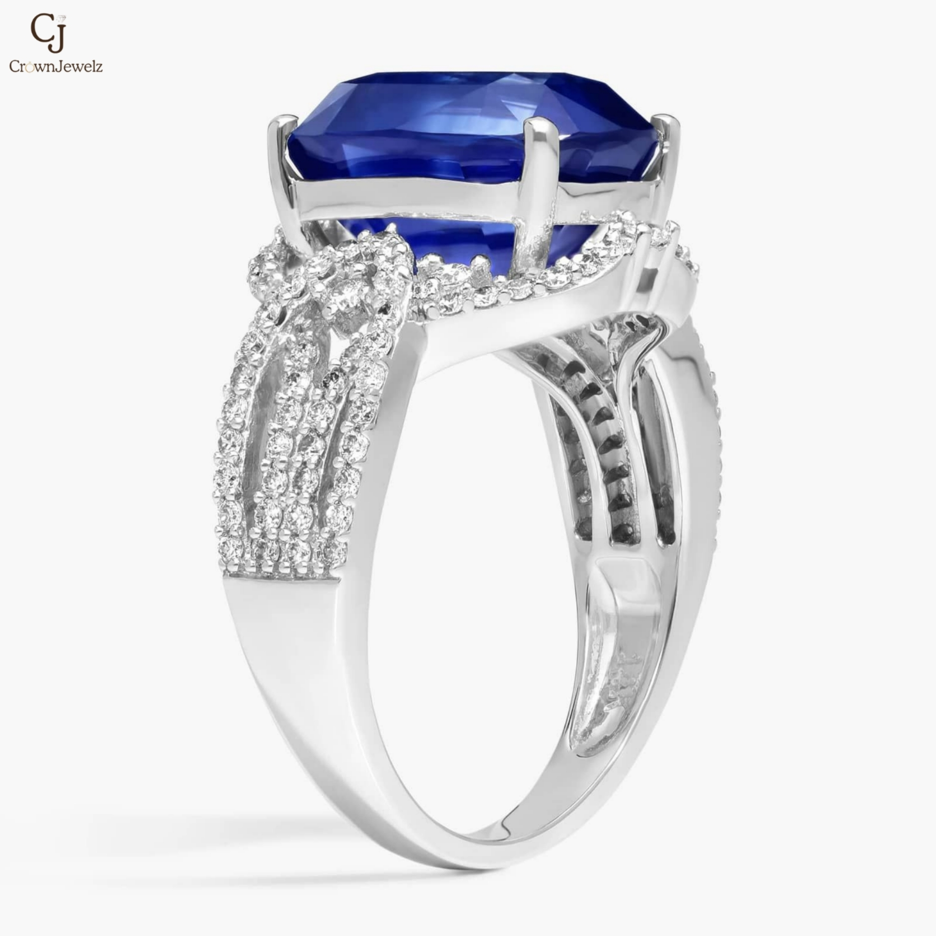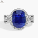 A breathtaking cushion-cut blue sapphire takes center stage, radiating rich depth and royal allure. Encircled by a shimmering diamond halo and complemented by intricately set diamond bands, this ring is pure brilliance from every angle. Crafted in luminous white gold, it’s a statement of timeless elegance and refined luxury.