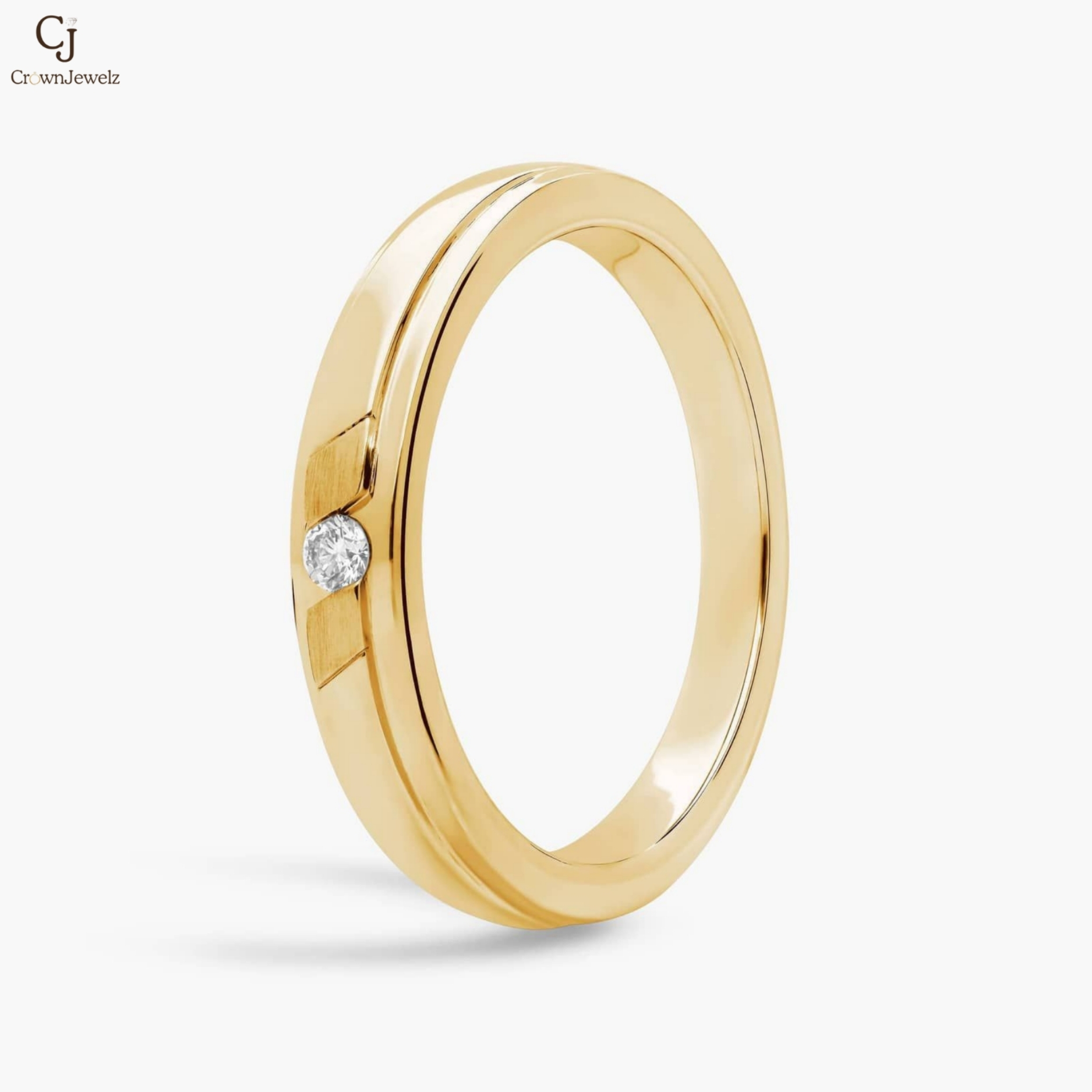 Sleek and timeless, this yellow gold band is accented with a single brilliant diamond set within a modern geometric detail. The polished finish enhances its clean lines and understated elegance. Perfect as a wedding band or everyday piece, it’s a refined symbol of lasting style and commitment.