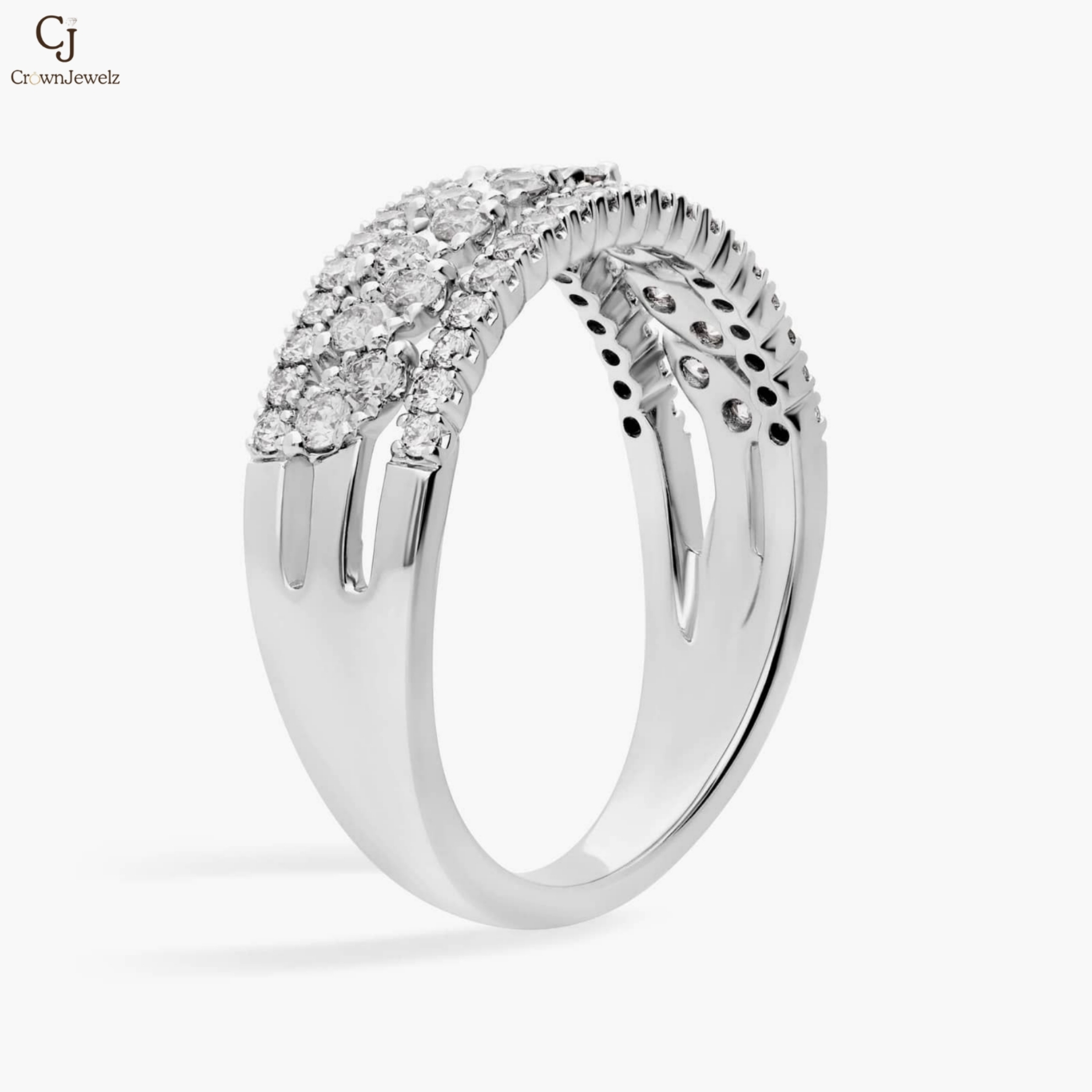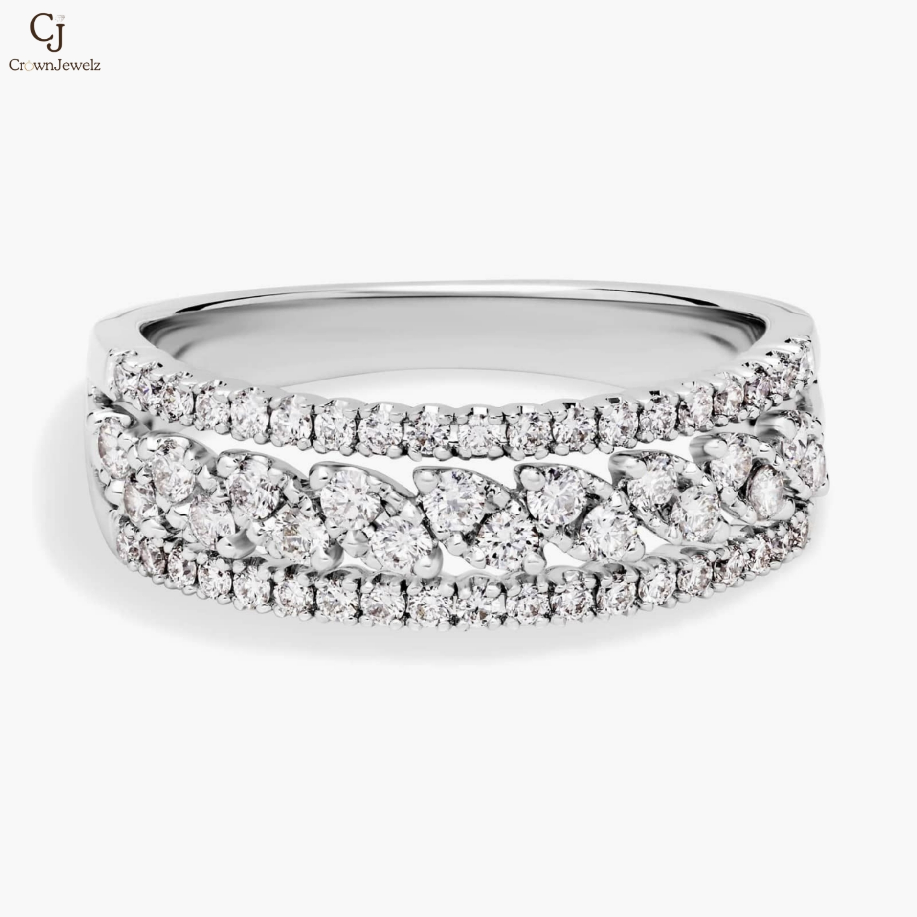 An elegant fusion of texture and brilliance, this diamond band features a layered design with shimmering pavé edges and a striking marquise-inspired center row. The intricate setting enhances each diamond’s sparkle, creating depth and dimension. Crafted in luminous white gold, it radiates timeless sophistication. A refined statement piece perfect for everyday luxury or special occasions.