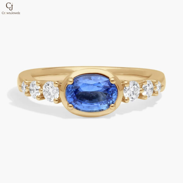 East-West Oval Cut Sapphire Ring With Half Bezel and Diamond Accent In 14K Yellow Gold