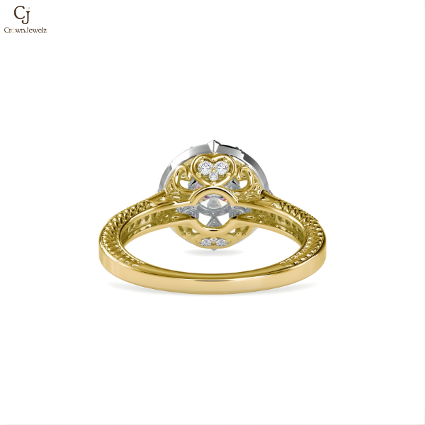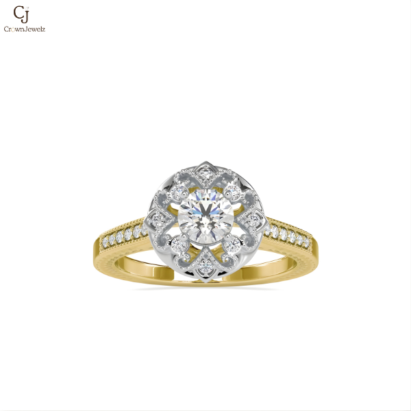 The Elysian Halo Diamond Ring is a timeless expression of elegance and refinement. Featuring a brilliant round-cut center diamond encircled by an intricate vintage-inspired halo, this ring radiates exceptional sparkle from every angle. Crafted in rich yellow gold with a contrasting white gold setting, the design is enhanced by pavé-set diamonds along the band, adding depth and brilliance. Perfectly balanced between classic charm and modern luxury, this ring is designed to symbolize everlasting love and sophistication.