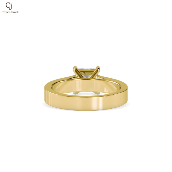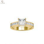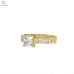 An elegant older-style engagement ring featuring a square princess-cut center stone set in a traditional four-prong setting. The warm rose-gold band is accented with channel-set baguette or princess-cut side stones, creating a refined, timeless look. The solid, slightly wider band reflects classic craftsmanship, offering both durability and understated luxury. This design is perfect for those who appreciate vintage-inspired elegance with clean, structured lines.