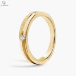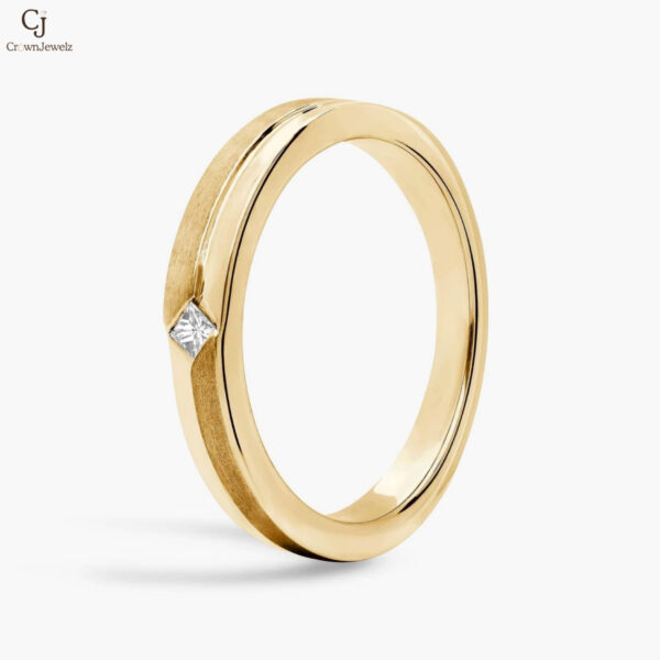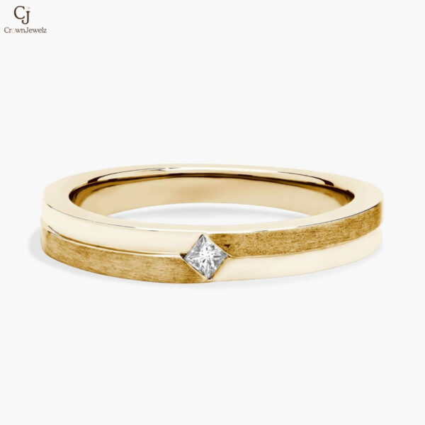 Modern and refined, this yellow gold band features a sleek brushed finish accented by a striking princess-cut diamond at its center. The clean lines and subtle texture create a perfect balance of simplicity and sophistication. Ideal as a wedding band or minimalist statement piece, it’s timeless elegance with a contemporary edge.