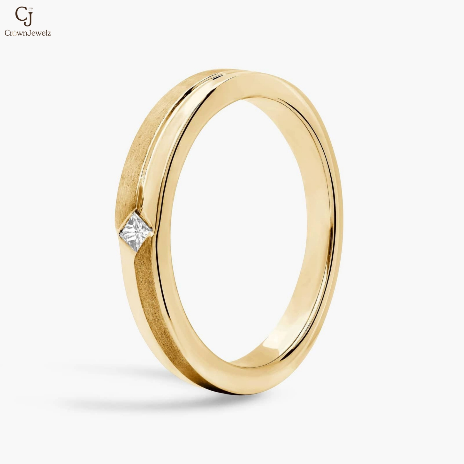 Modern and refined, this yellow gold band features a sleek brushed finish accented by a striking princess-cut diamond at its center. The clean lines and subtle texture create a perfect balance of simplicity and sophistication. Ideal as a wedding band or minimalist statement piece, it’s timeless elegance with a contemporary edge.