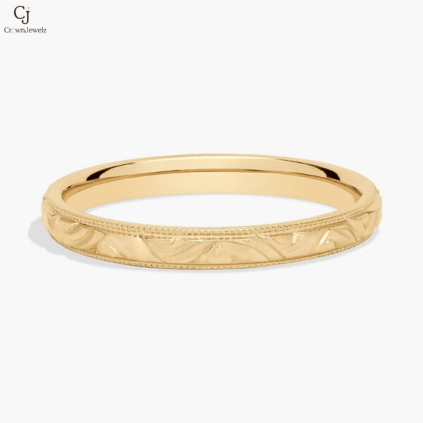 Gracefully crafted in radiant yellow gold, this elegant band features intricate engraved detailing framed by delicate milgrain edges. The subtle texture adds depth and vintage-inspired charm to its classic silhouette. Perfect as a wedding band or stacking piece, it’s a timeless expression of refined craftsmanship.