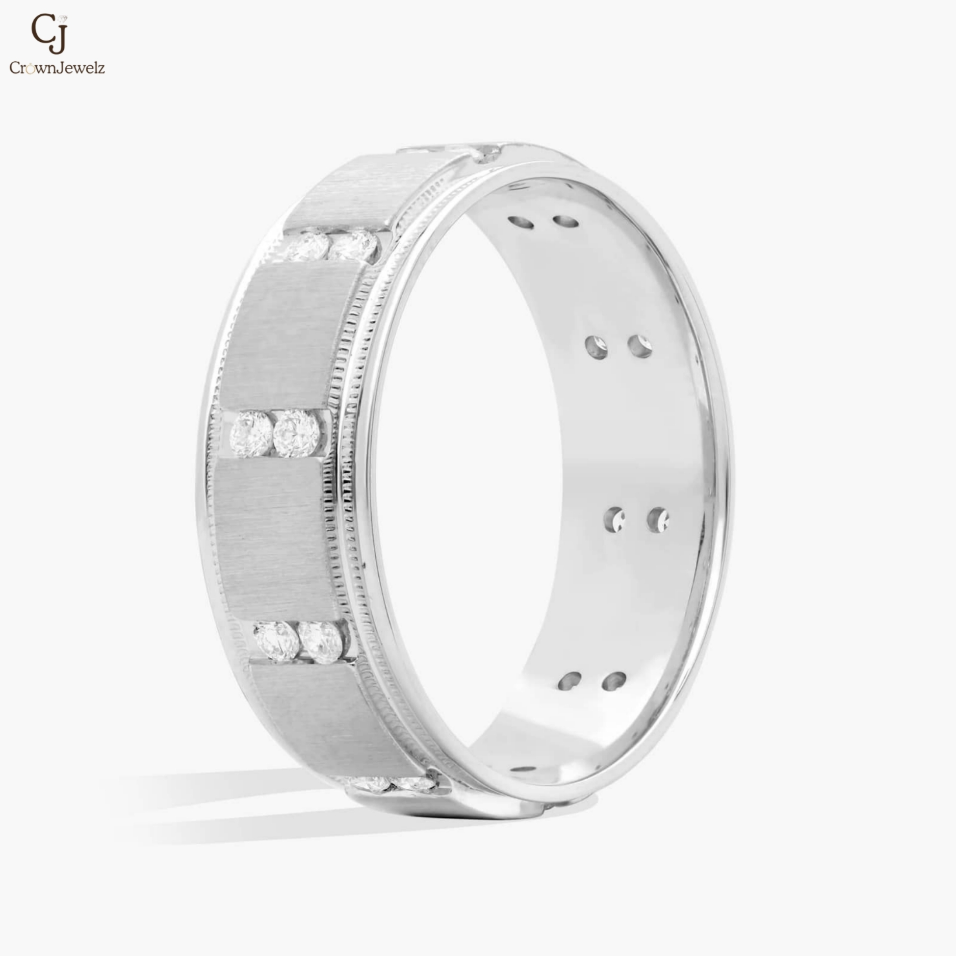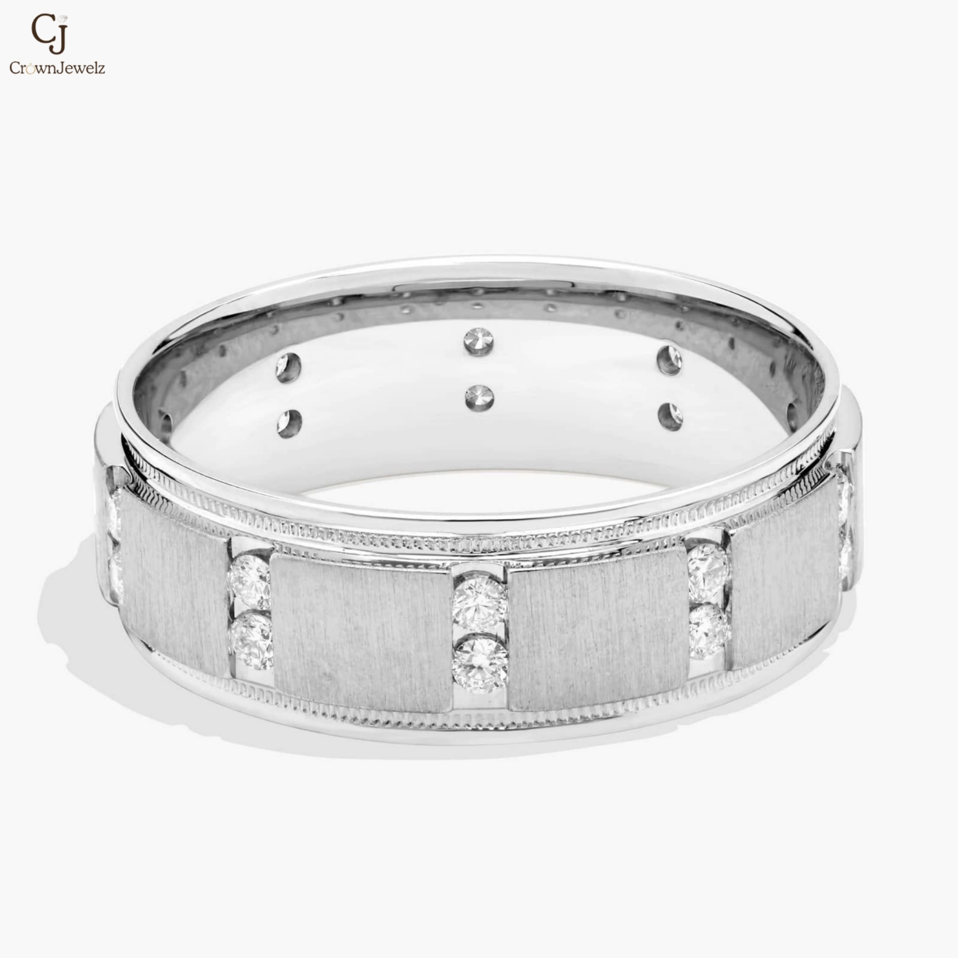 Bold and distinguished, this white gold band showcases a brushed finish accented by vertical rows of brilliant diamonds. Milgrain detailing along the edges adds a refined, vintage-inspired touch. Designed for timeless elegance, it’s a powerful statement of commitment and sophisticated style.