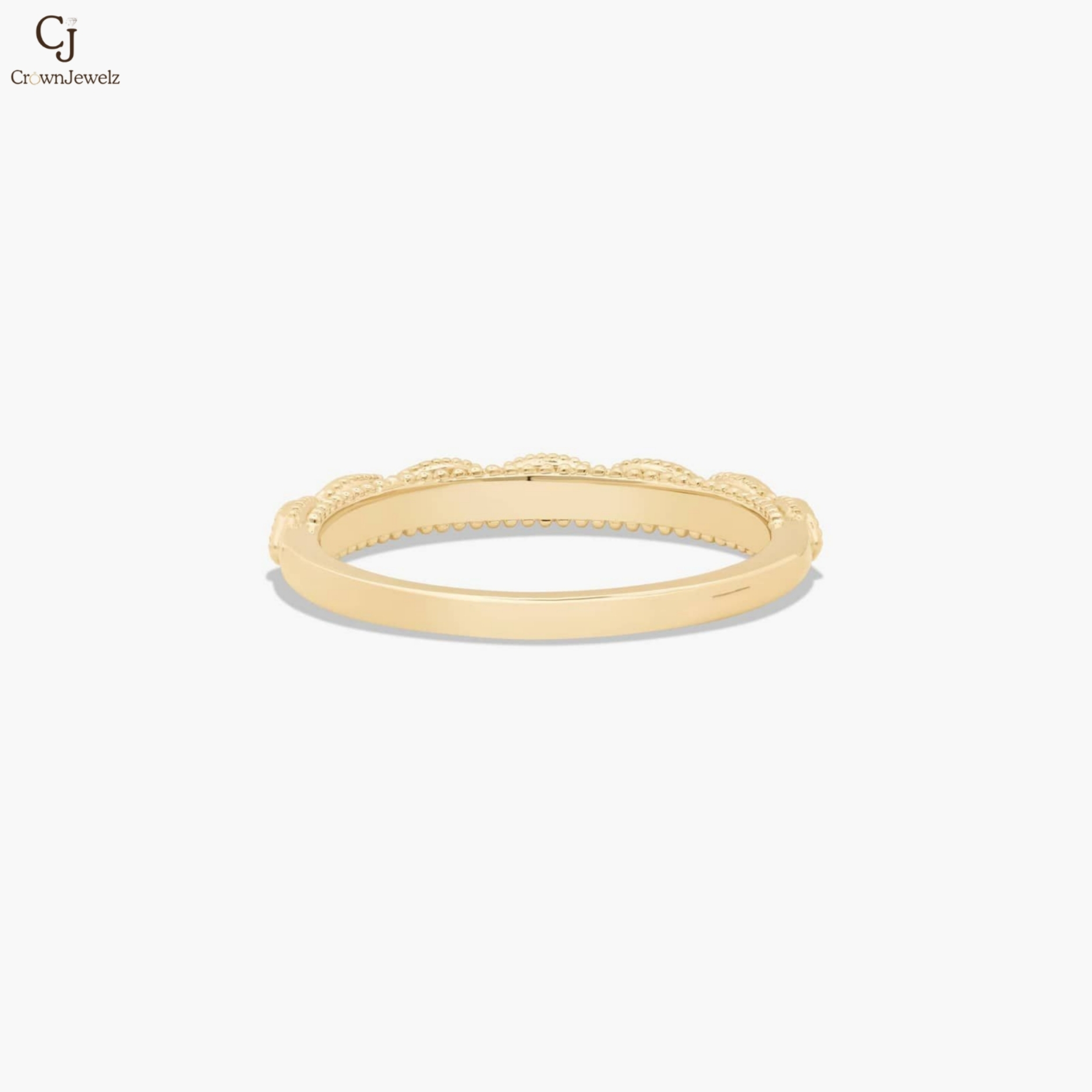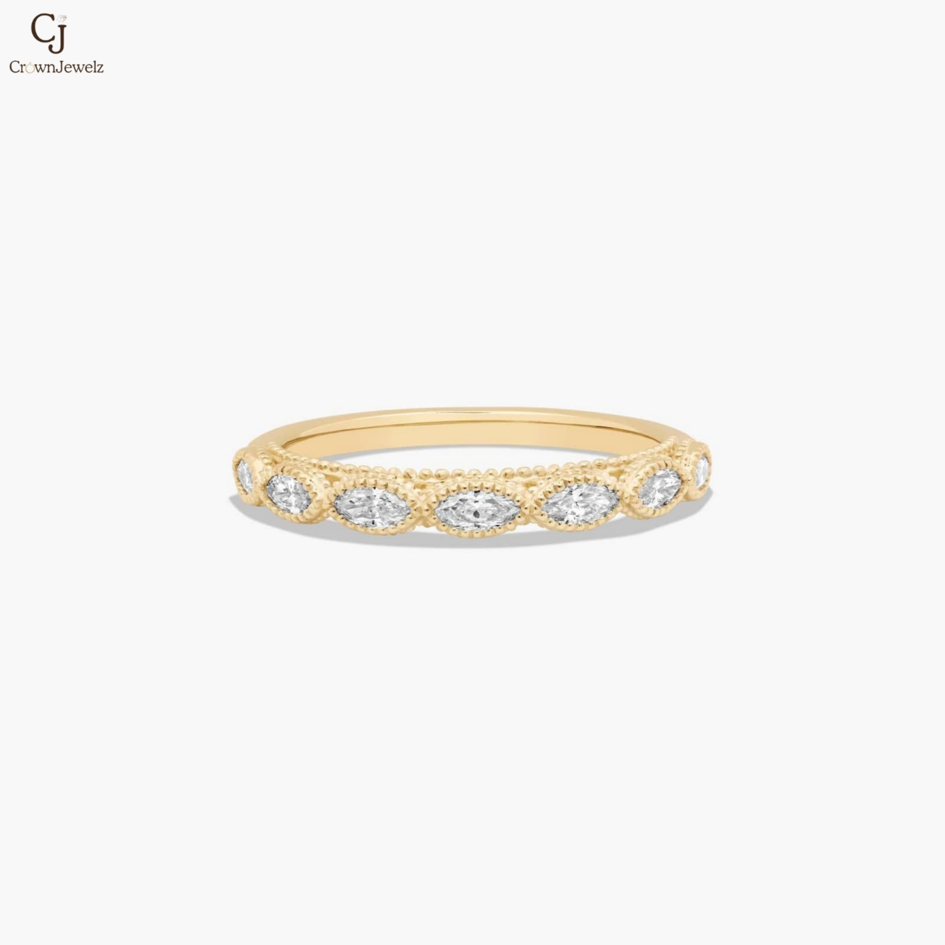 Elegant and intricately detailed, this gold band features marquise-cut diamonds framed by delicate beaded accents. The continuous pattern creates a graceful rhythm of sparkle and texture. Its refined silhouette makes it perfect for stacking or wearing as a statement on its own. A timeless design that blends vintage charm with modern sophistication.