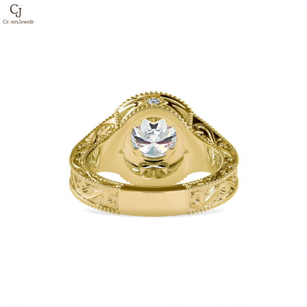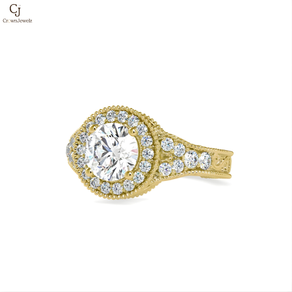 A luminous round diamond set in warm rose gold, enhanced by delicate pavé accents along the band. Soft, romantic, and effortlessly luxurious.