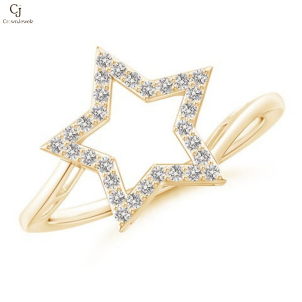 Playful yet elegant, this rose gold ring features a dazzling star-shaped design outlined with sparkling diamonds. The open star motif adds a modern and whimsical touch while capturing light from every angle. Its sleek band keeps the look refined and balanced. A charming piece that shines with personality and brilliance.