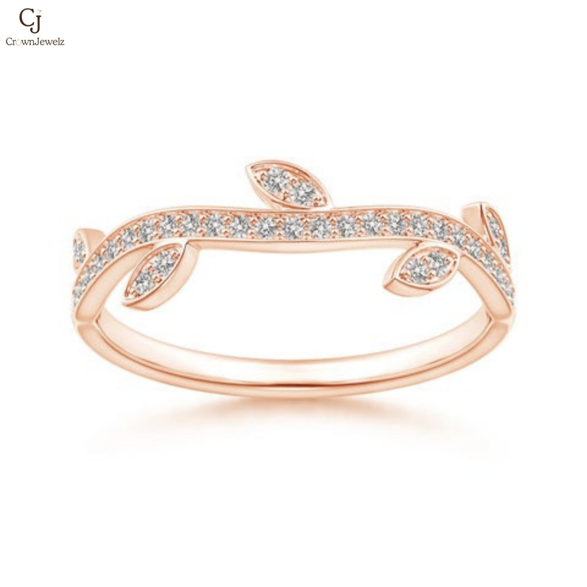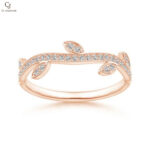 Graceful and nature-inspired, this rose gold ring captures the beauty of delicate vines. A sparkling row of diamonds flows along the branch, accented by shimmering leaf details for a soft, elegant touch. The warm rose hue enhances its romantic charm and modern appeal. Perfect for stacking or wearing alone as a subtle statement of sophistication.