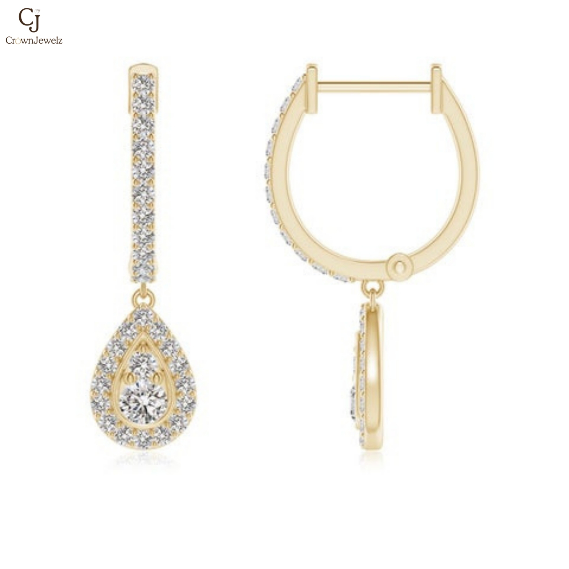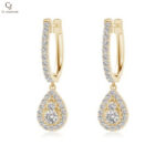 These exquisite gold drop earrings feature a sparkling hoop design that gracefully leads to a teardrop-shaped pendant adorned with brilliant stones. The layered detailing adds depth and elegance, creating a radiant and eye-catching look. Perfect for special occasions or elevating everyday style, they embody timeless glamour and refined sophistication.
