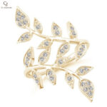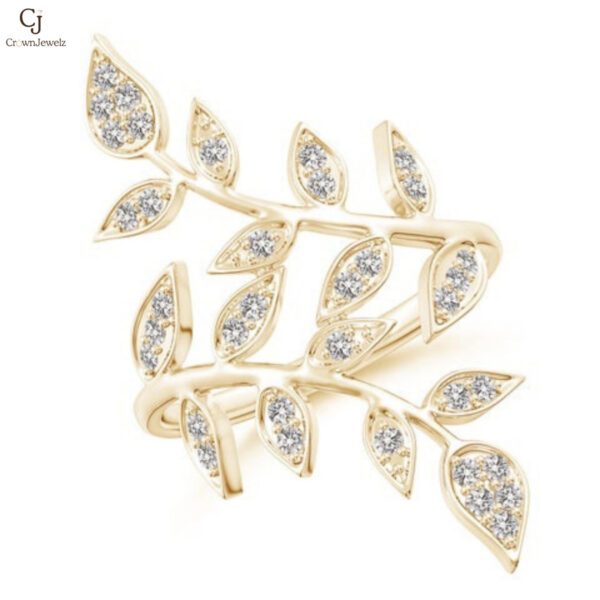 Inspired by nature’s beauty, this enchanting yellow gold ring blooms with delicate leaf motifs adorned in shimmering diamonds. Each marquise-shaped leaf sparkles gracefully, creating a look that’s both elegant and whimsical. A statement of effortless charm, it wraps your finger in golden brilliance and organic sophistication.