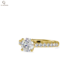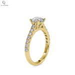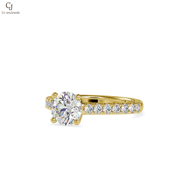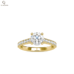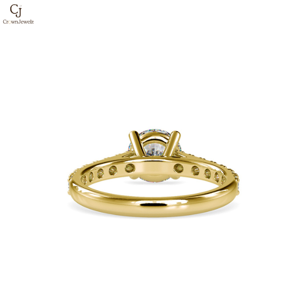 engagement ring features a brilliant round-cut solitaire diamond set in warm rose gold. The center stone is securely held by a classic four-prong setting, elevated to maximize sparkle and light reflection. Delicate pavé-set diamonds line the band, adding subtle brilliance and enhancing the ring’s refined silhouette. Timeless yet romantic, this design beautifully balances modern elegance with classic charm—perfect for a meaningful proposal or special milestone.