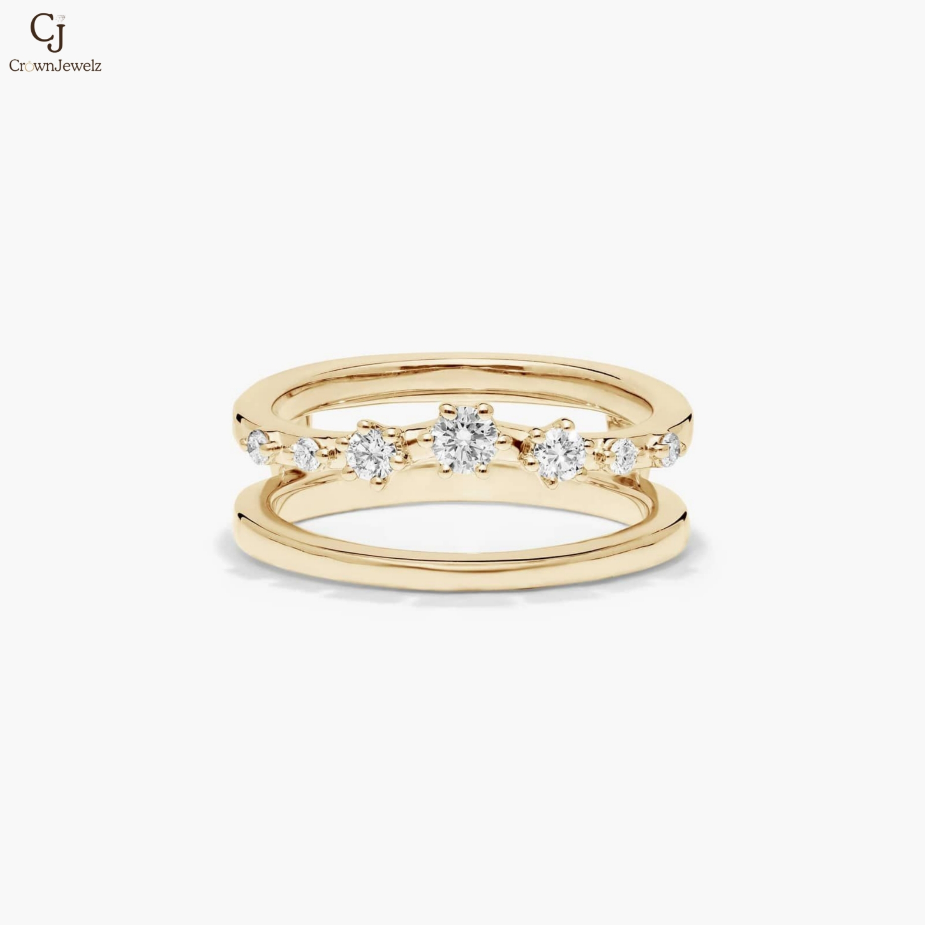 Gracefully layered, this yellow gold ring features a delicate double-band silhouette crowned with brilliant round diamonds. The graduating center stones create a soft, radiant sparkle that catches the light from every angle. Elegant yet contemporary, it’s a refined piece designed to shine beautifully on its own or stacked.