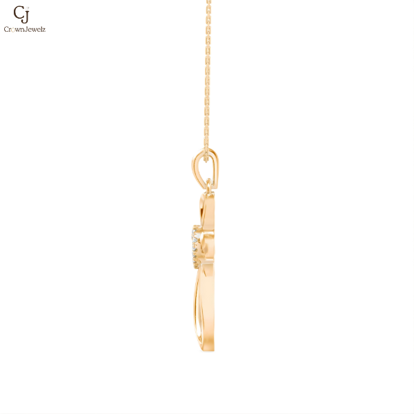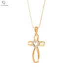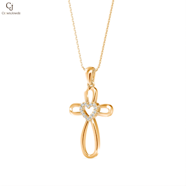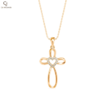 Pure Grace Cross Pendant features a sleek open-form gold cross with a heart at its center, symbolizing faith, love, and spiritual elegance. Its smooth flowing lines give this meaningful design a refined and contemporary feel.