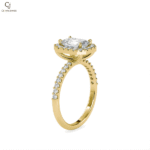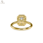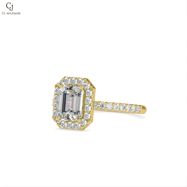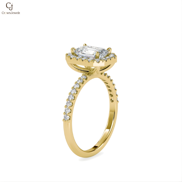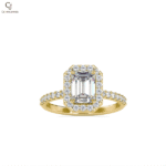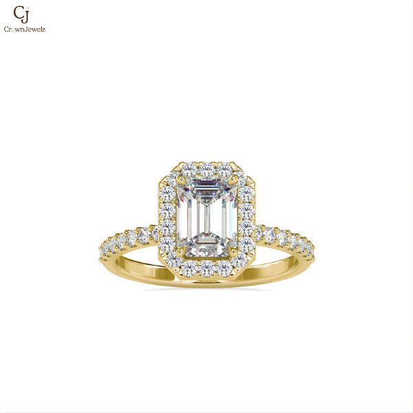 This elegant engagement ring features a striking emerald-cut center diamond set in a refined halo of round brilliant diamonds, enhancing its brilliance and presence. The band is crafted in rose gold and adorned with delicate pave-set diamonds along the shoulders, adding sparkle from every angle. Four secure prongs hold the center stone, while the halo creates a timeless, sophisticated silhouette. Perfect for someone who loves classic luxury with a modern touch.