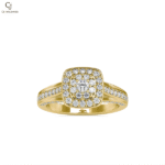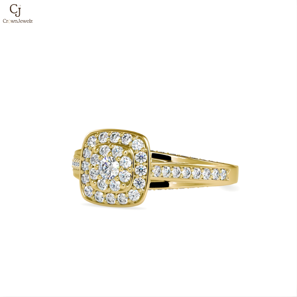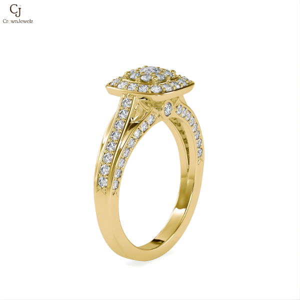 Exquisitely crafted in radiant gold, the Eternal Bloom ring showcases a sparkling round center diamond framed by a cushion-shaped double halo of brilliant pavé diamonds. The split shank band is delicately lined with shimmering diamonds, enhancing the ring’s elegance and brilliance from every angle. A romantic yet timeless design, this ring is perfect for celebrating love, commitment, and life’s most meaningful moments.