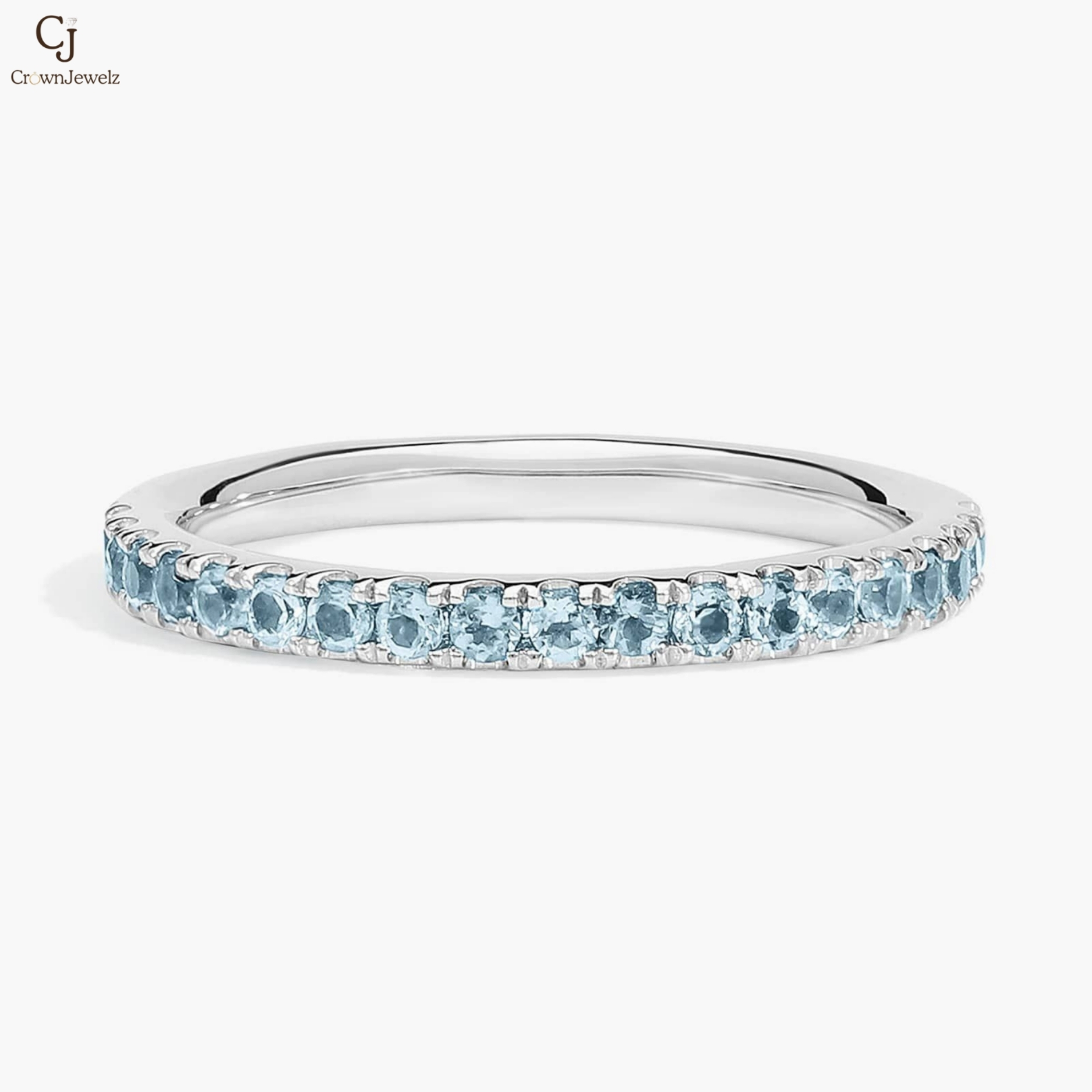 Delicate and radiant, this elegant band features a continuous row of shimmering light blue gemstones that sparkle beautifully in every light. The sleek polished setting enhances the soft, refreshing color of each stone. Its minimal and refined design makes it perfect for stacking or wearing alone. A timeless piece that adds a subtle touch of brilliance and charm.