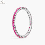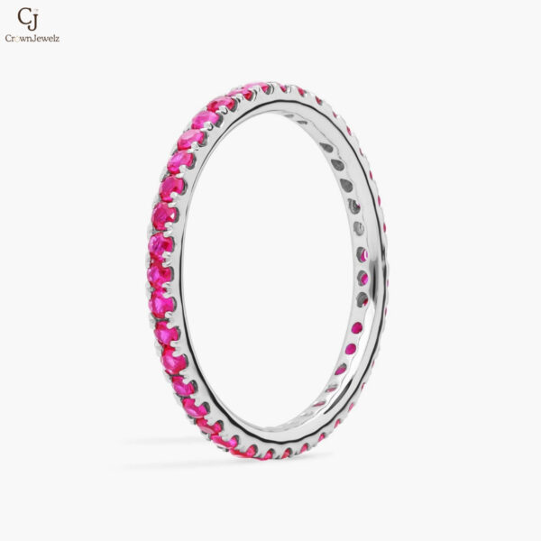 This elegant eternity ring showcases a beautiful blend of sparkling white diamonds and vibrant ruby gemstones. The seamless arrangement creates a striking contrast that captures light from every angle. Set in a sleek, polished band, the design symbolizes endless love and timeless beauty. A refined piece perfect for adding color and brilliance to any jewelry collection.