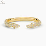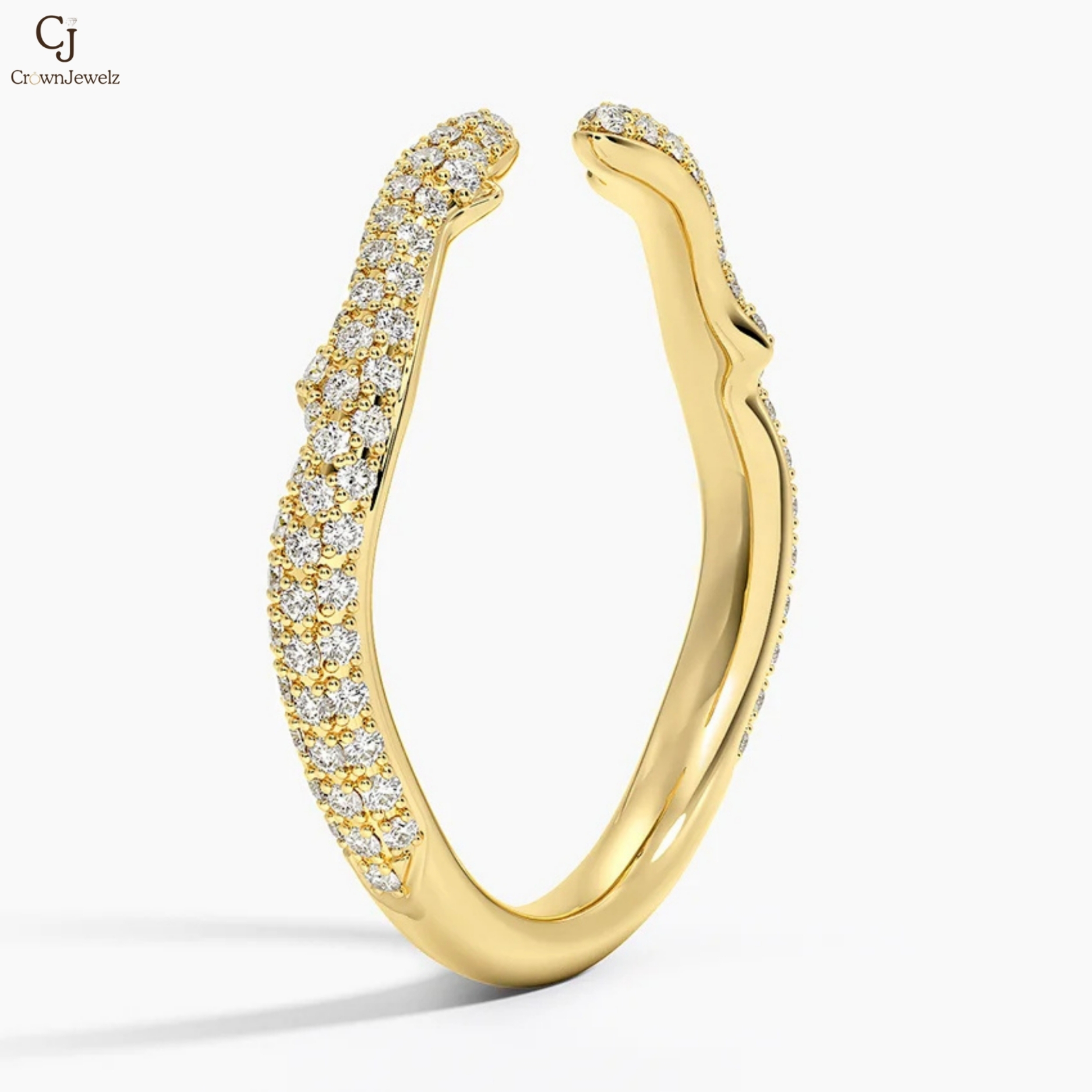 Modern and radiant, this rose gold open ring features two curved ends beautifully set with shimmering pavé diamonds. The sleek, flowing design creates a graceful silhouette that sparkles from every angle. Its warm rose gold finish enhances the brilliance of the stones while adding a touch of luxury. A stylish piece perfect for elevating both everyday and special occasion looks.