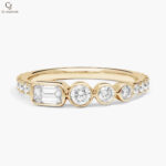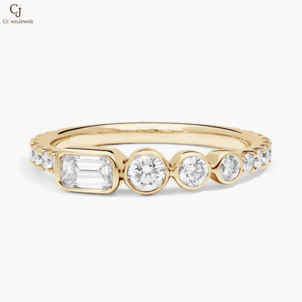 Modern elegance meets timeless sparkle in this refined gold band. Featuring a sleek emerald-cut diamond accented by a graduating row of brilliant round stones, it creates a harmonious balance of shape and shine. The delicate pavé detailing along the band adds an extra touch of radiance. A chic and versatile piece designed for effortless everyday luxury.
