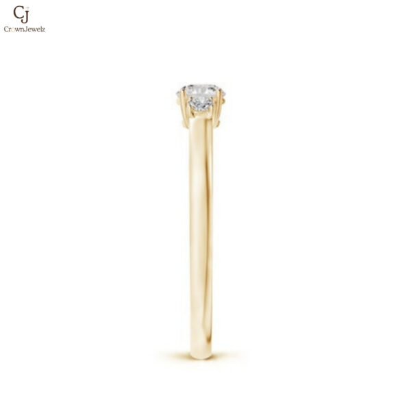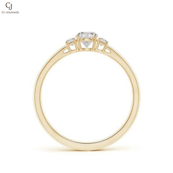Classic and timeless, this gold ring features a brilliant round center diamond accented by two sparkling side stones. The balanced three-stone design symbolizes past, present, and future, adding meaningful elegance to its beauty. Its sleek band enhances the brilliance of each diamond. A graceful piece perfect for celebrating love and life’s special moments.