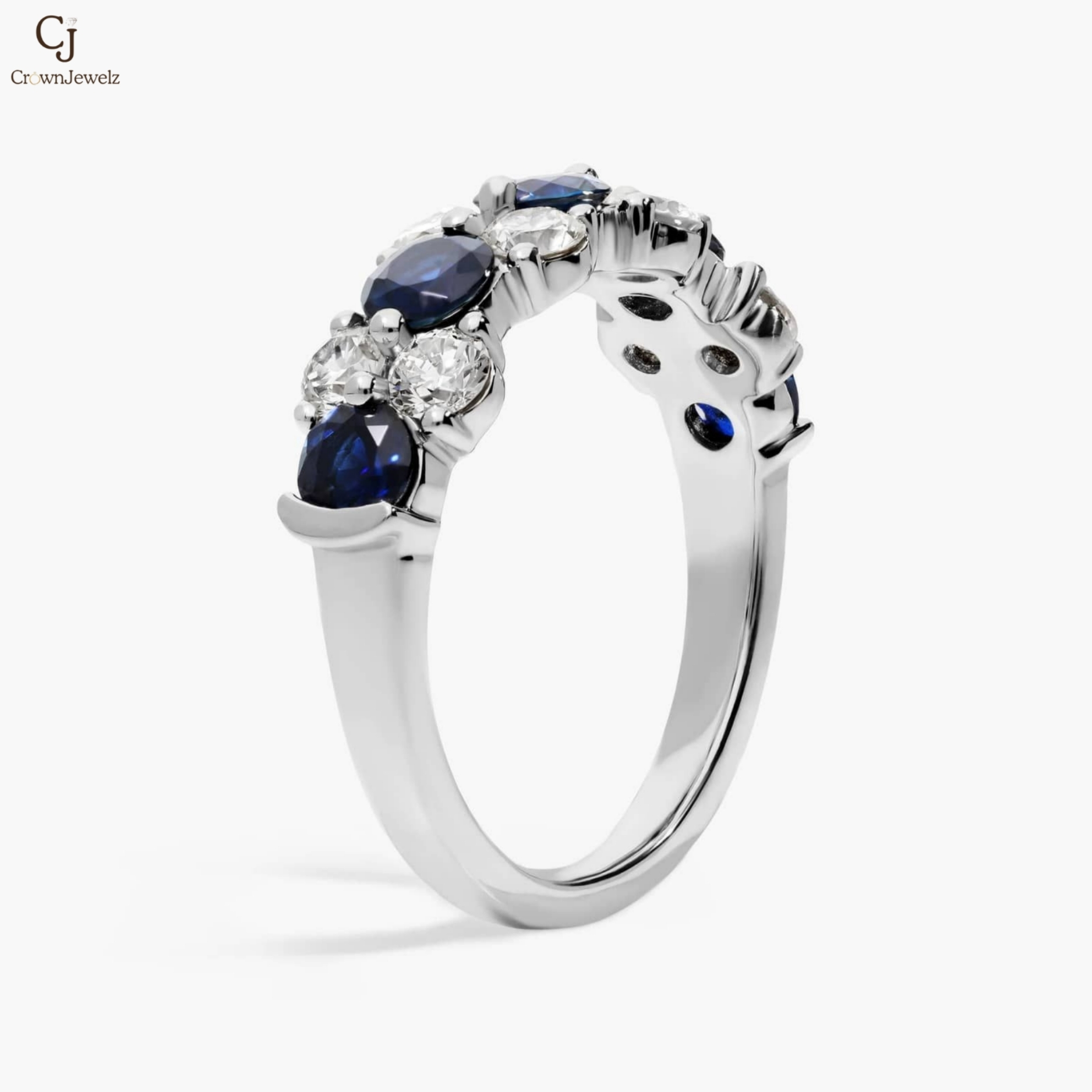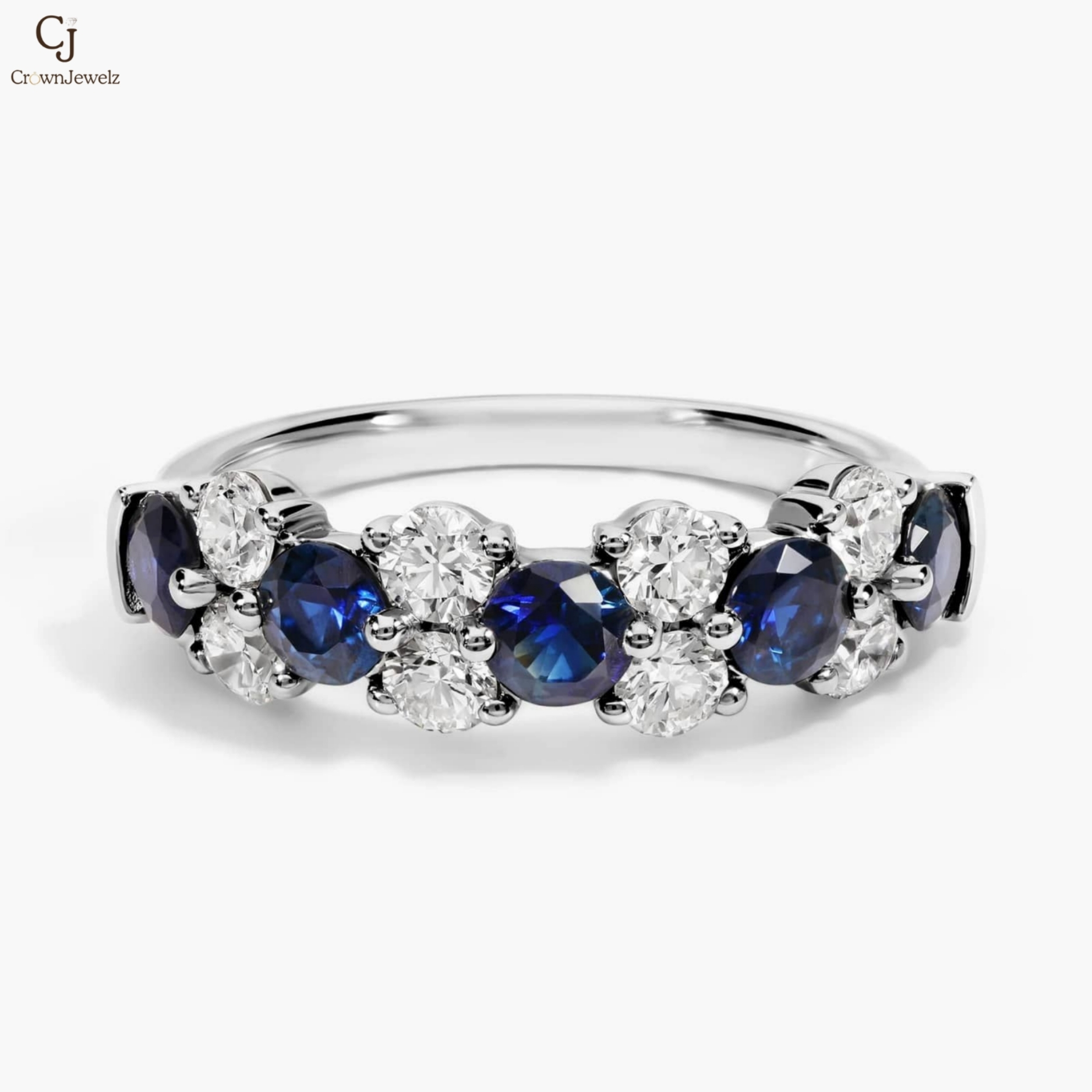 Elegant and captivating, this white gold band features deep blue sapphires beautifully paired with brilliant round diamonds. The alternating stones create a striking contrast of color and sparkle. Sophisticated and timeless, it’s a radiant piece perfect for celebrating life’s most meaningful moments.