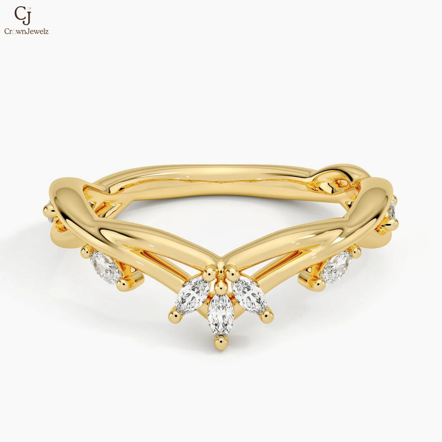 Delicate and elegant, this rose gold ring features a graceful V-shaped design adorned with shimmering marquise-cut diamonds. The stones are beautifully arranged like petals, creating a soft floral-inspired sparkle. The warm rose gold setting enhances the brilliance while adding a romantic touch. A refined piece perfect for stacking or wearing as a unique statement of elegance.