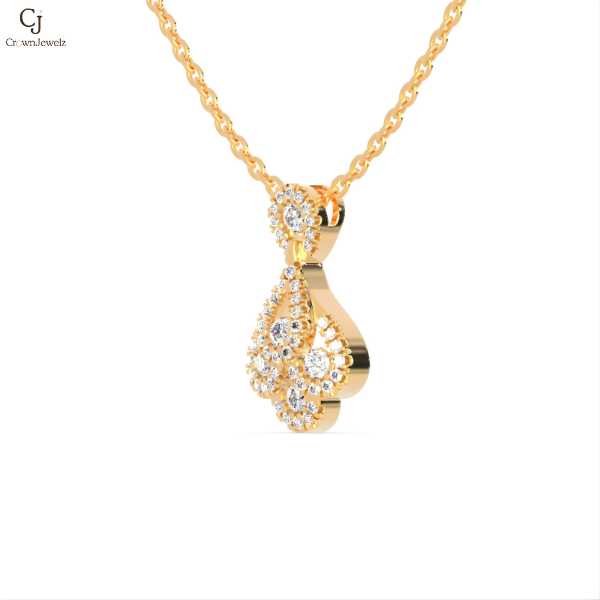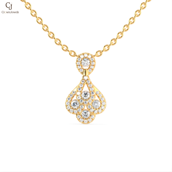 graceful yellow-gold teardrop design adorned with delicate round diamonds, creating a soft floral-inspired silhouette that sparkles with elegant charm and timeless beauty.