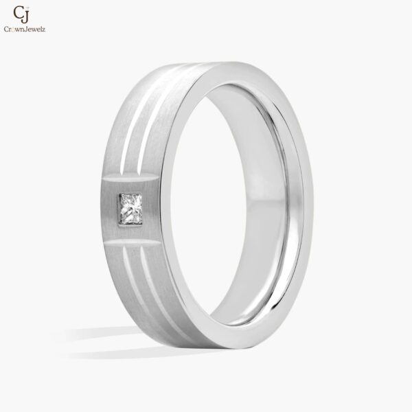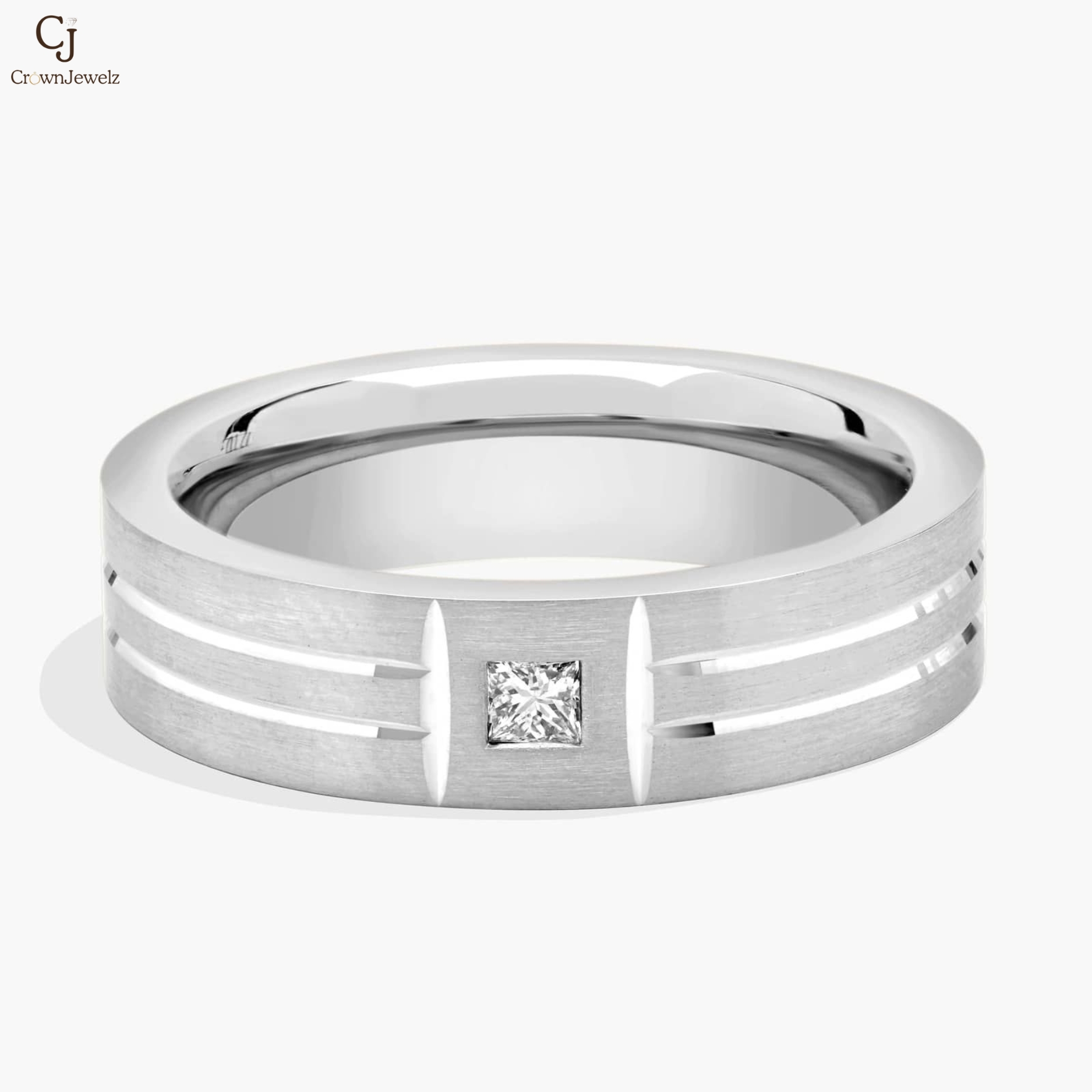 Sleek and contemporary, this white gold band features a striking princess-cut diamond set at its center. The brushed finish and clean groove detailing add depth and modern character. A refined statement piece designed for timeless everyday wear.