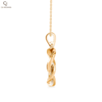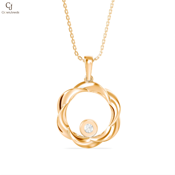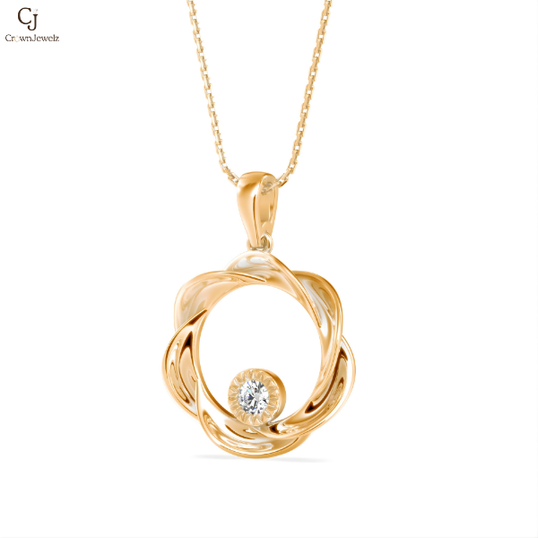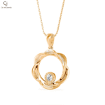 Solara Orbit Diamond Pendant features softly twisted gold bands that encircle a radiant diamond, creating a graceful orbital design. The flowing curves symbolize unity and endless beauty, while the polished gold enhances the diamond’s glow. This elegant pendant offers a perfect balance of romance and contemporary sophistication.