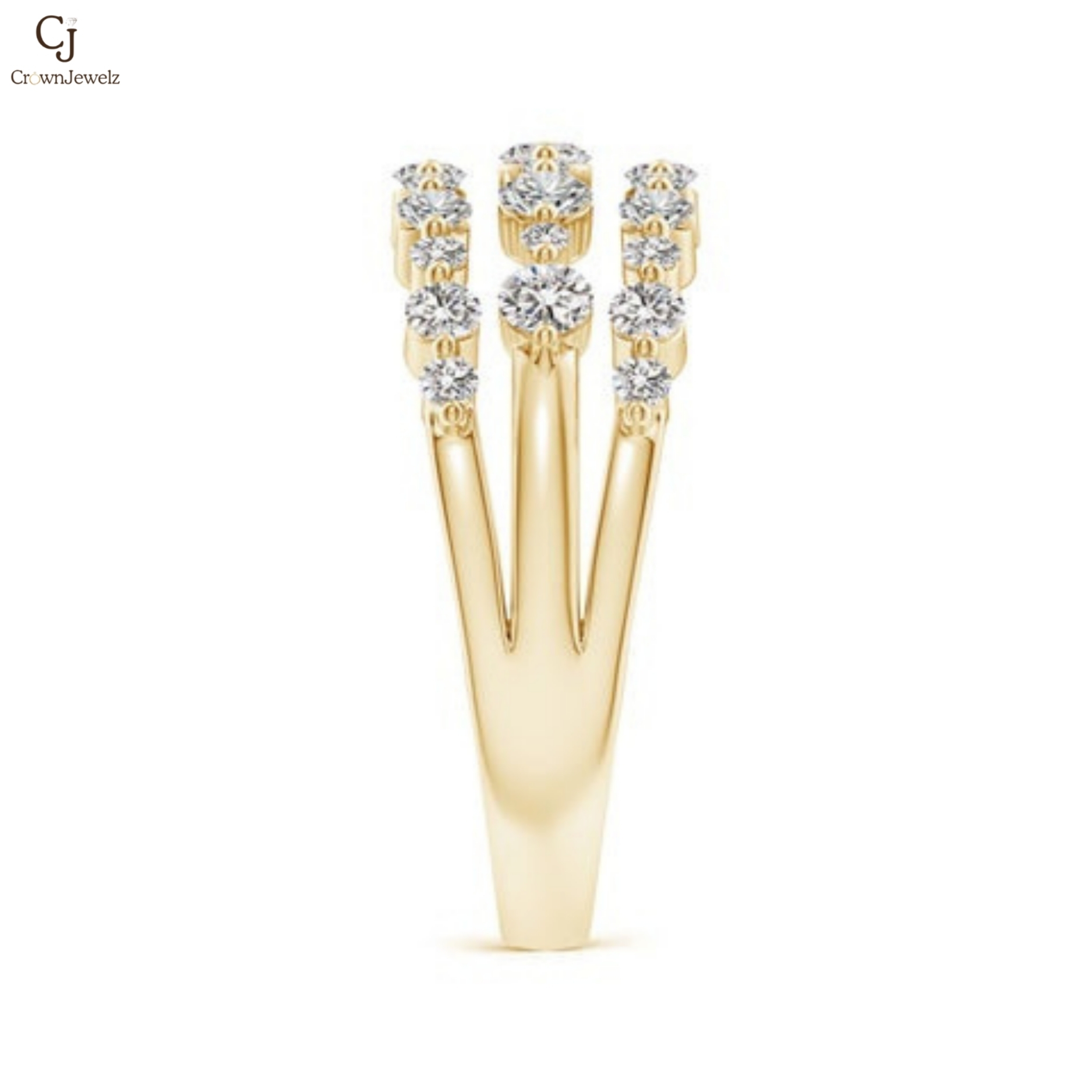 Radiating brilliance from every angle, this yellow gold ring showcases three shimmering rows of round diamonds in a beautifully layered design. The alternating stone sizes create depth, dimension, and captivating sparkle. Bold yet elegant, it’s a statement piece that embodies luxury and timeless sophistication.