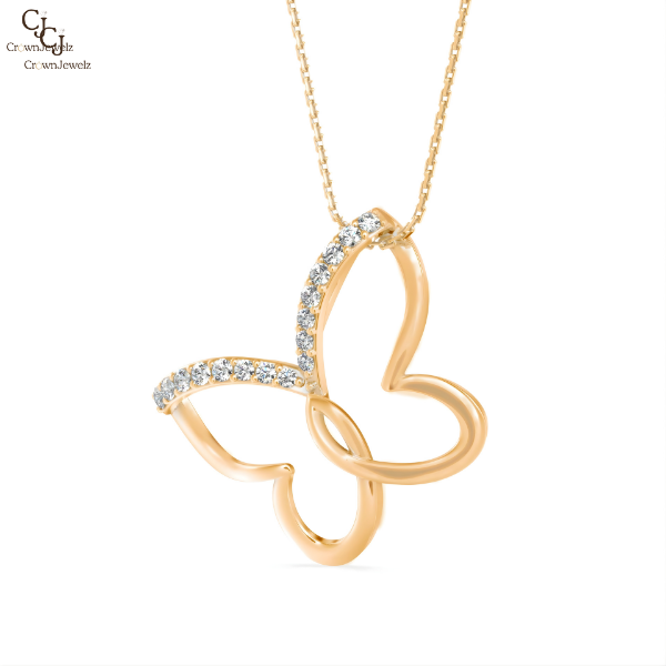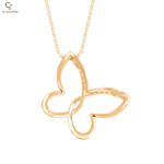 Trésor Flutter Pendant features a graceful open-frame butterfly crafted in polished gold, with softly rounded wings that symbolize freedom, elegance, and new beginnings. Its flowing silhouette creates a light, airy feel that moves beautifully with the chain, making it a refined statement of delicate luxury.