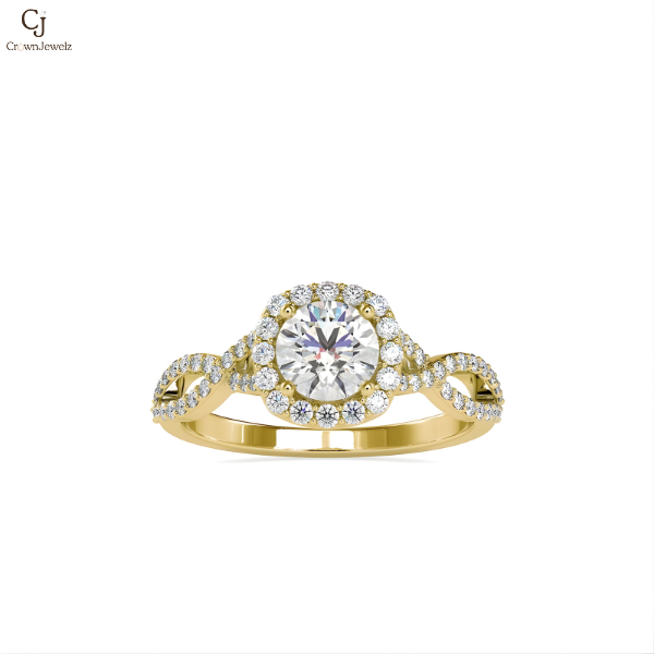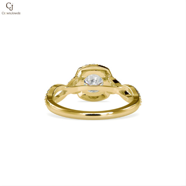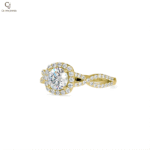 rose gold engagement ring features a brilliant round-cut center stone embraced by a shimmering halo of pavé diamonds. Delicate floral-inspired accents along the band add a romantic, vintage touch, while additional pavé diamonds on the shoulders enhance sparkle from every angle. Crafted to balance timeless beauty with intricate detail, this ring is perfect for someone who loves classic elegance with a soft, feminine feel.