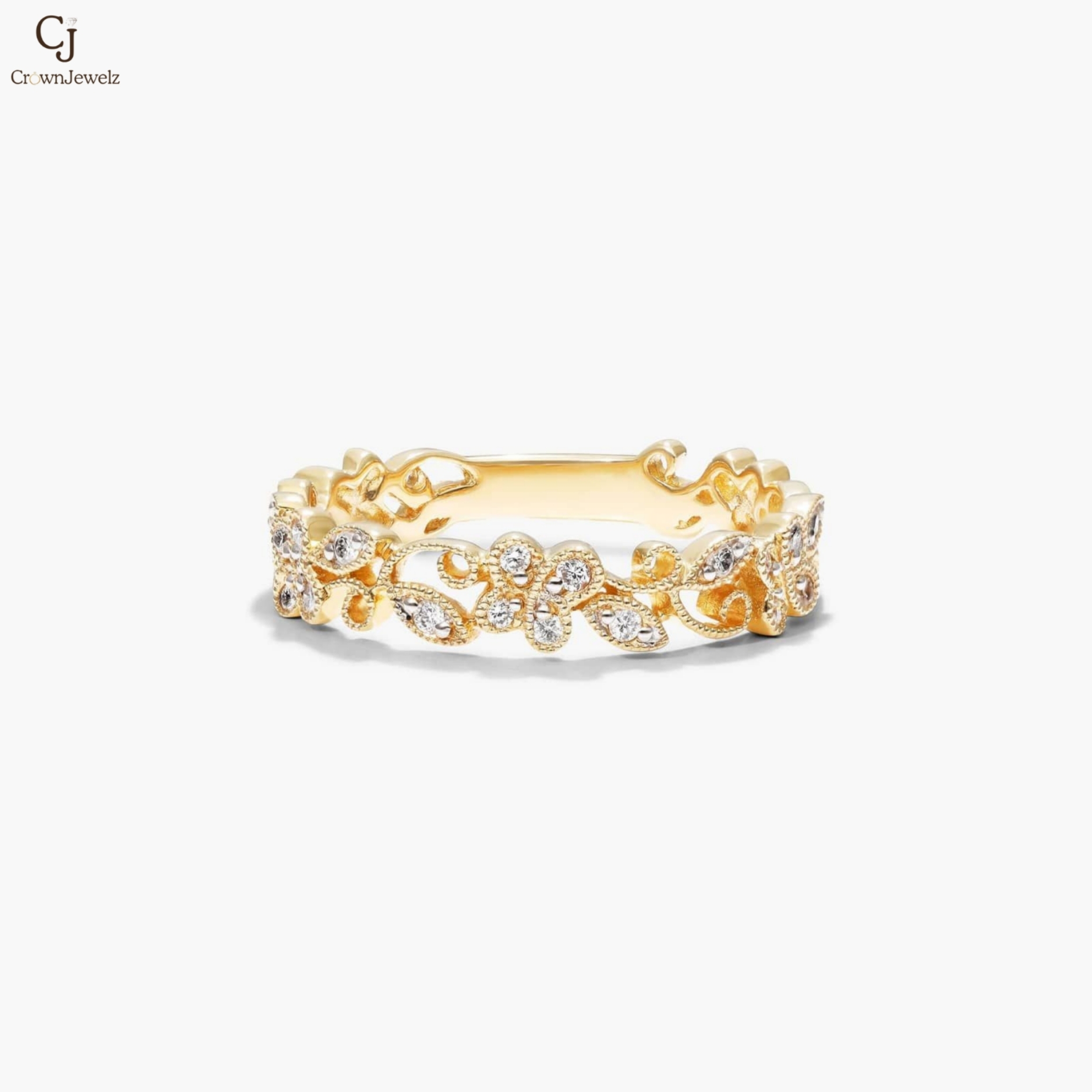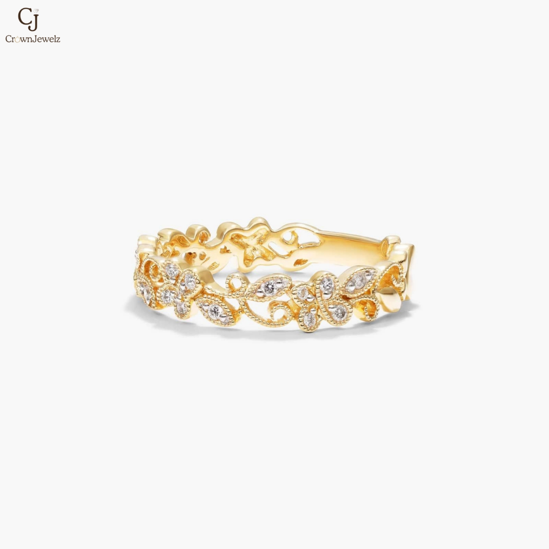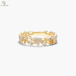 Delicately crafted in luminous yellow gold, this enchanting band features intricate floral filigree accented with shimmering diamonds. The openwork design adds a romantic, vintage-inspired charm to its graceful silhouette. Perfect for stacking or wearing alone, it’s a timeless piece that captures elegance in every detail.