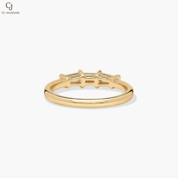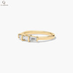 Sleek and contemporary, this yellow gold ring showcases a trio of baguette-cut diamonds in a clean, geometric setting. The structured design highlights each stone’s crisp lines and radiant sparkle. Minimal yet striking, it’s a modern classic perfect for everyday elegance or effortless stacking.