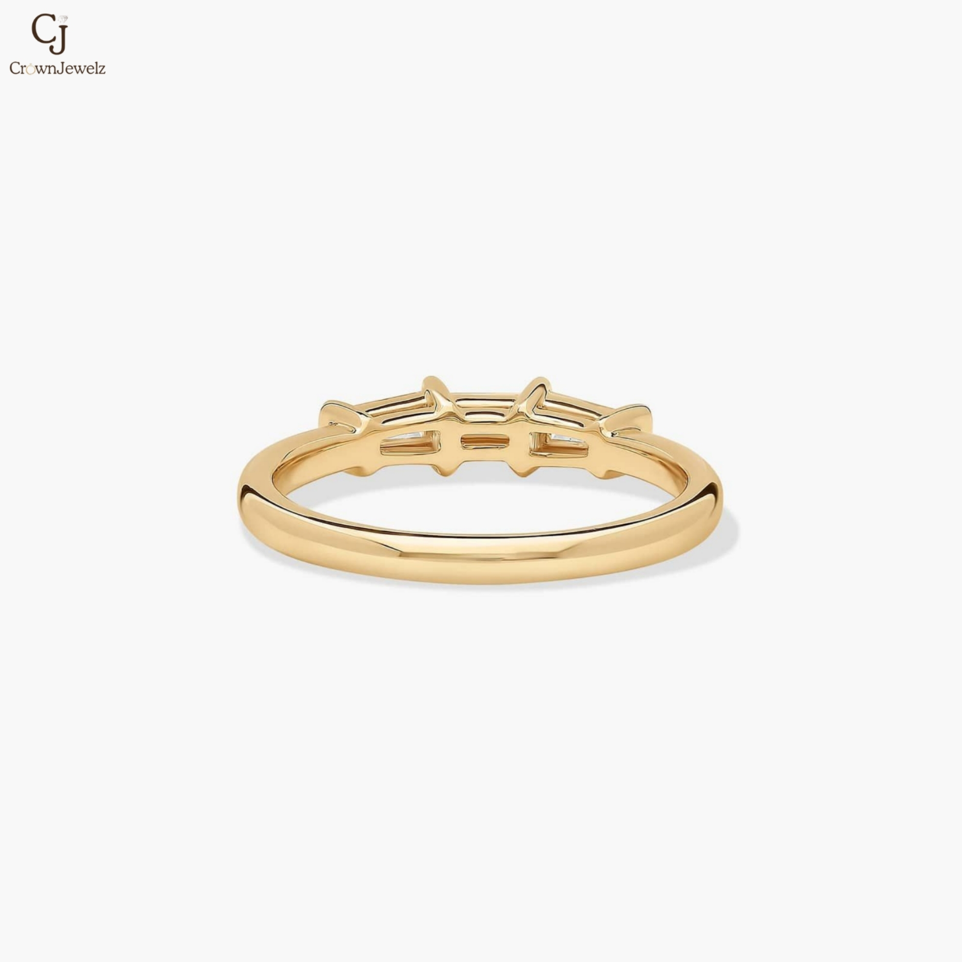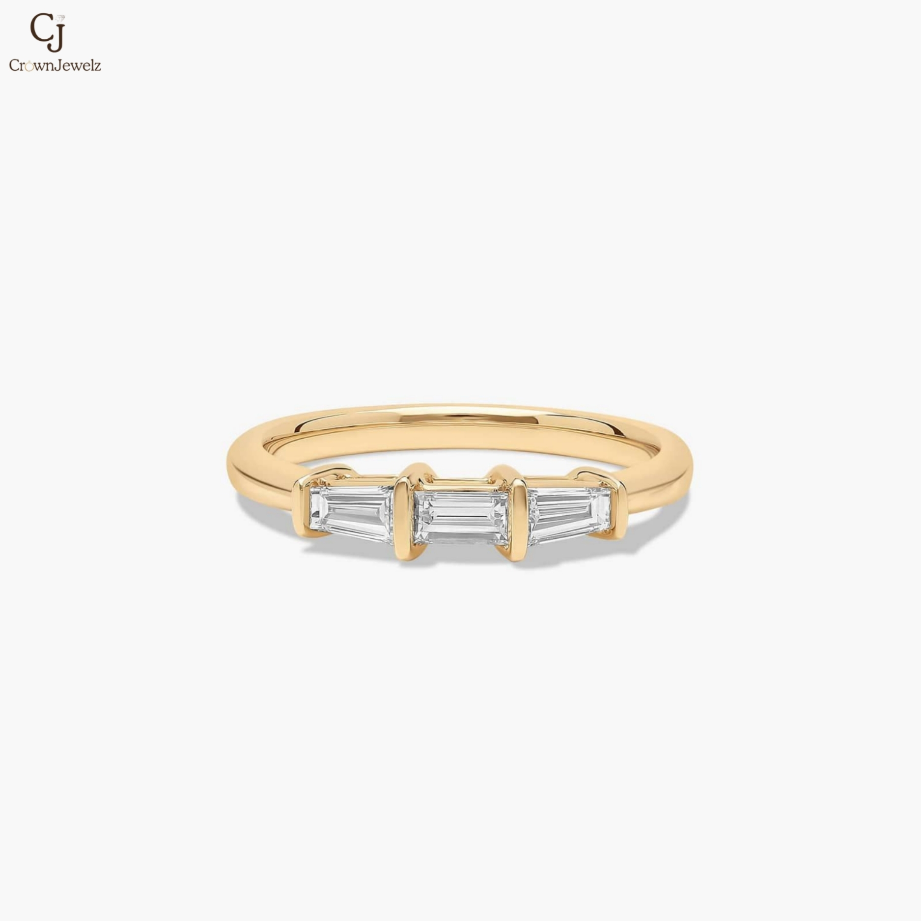 Sleek and contemporary, this yellow gold ring showcases a trio of baguette-cut diamonds in a clean, geometric setting. The structured design highlights each stone’s crisp lines and radiant sparkle. Minimal yet striking, it’s a modern classic perfect for everyday elegance or effortless stacking.