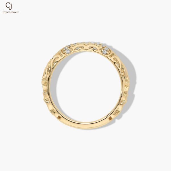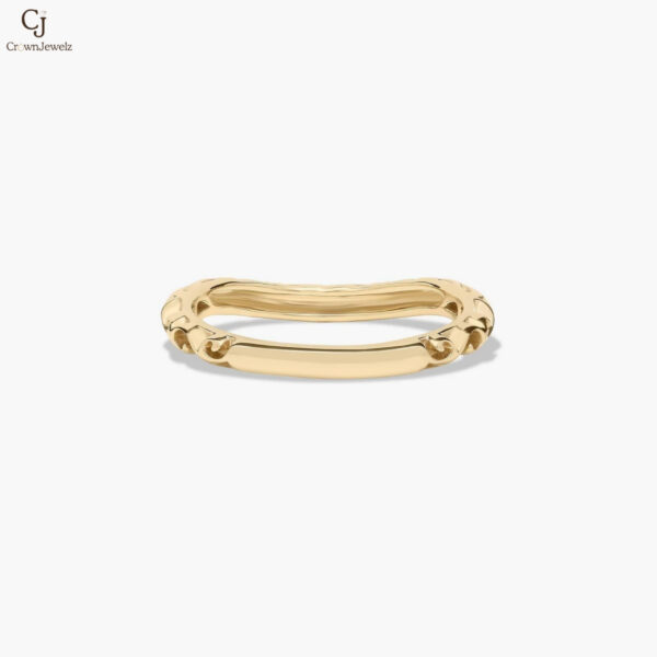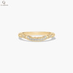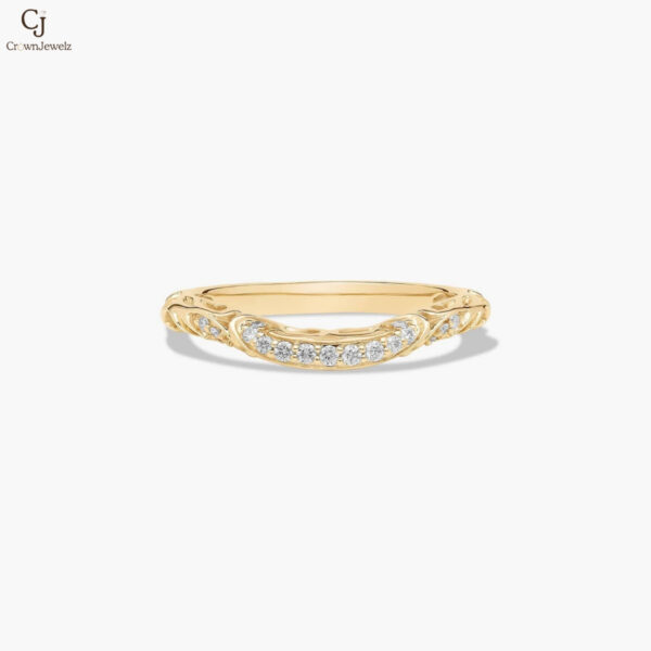 Gracefully crafted in warm yellow gold, this delicate band features flowing, vine-inspired details adorned with shimmering diamonds. The gentle curve and intricate design create a soft, romantic silhouette with subtle brilliance. Perfect for stacking or wearing alone, it adds an elegant touch of timeless charm.