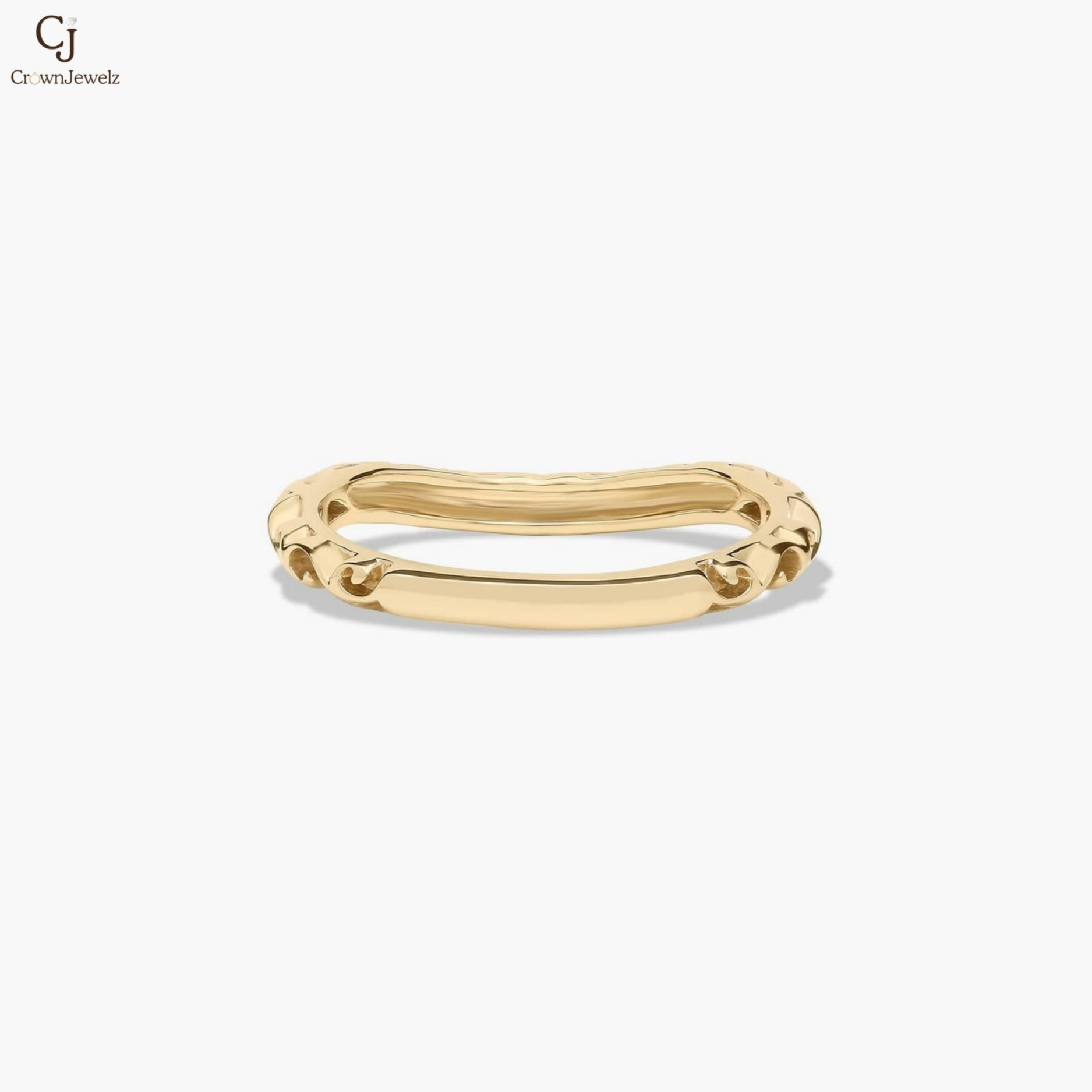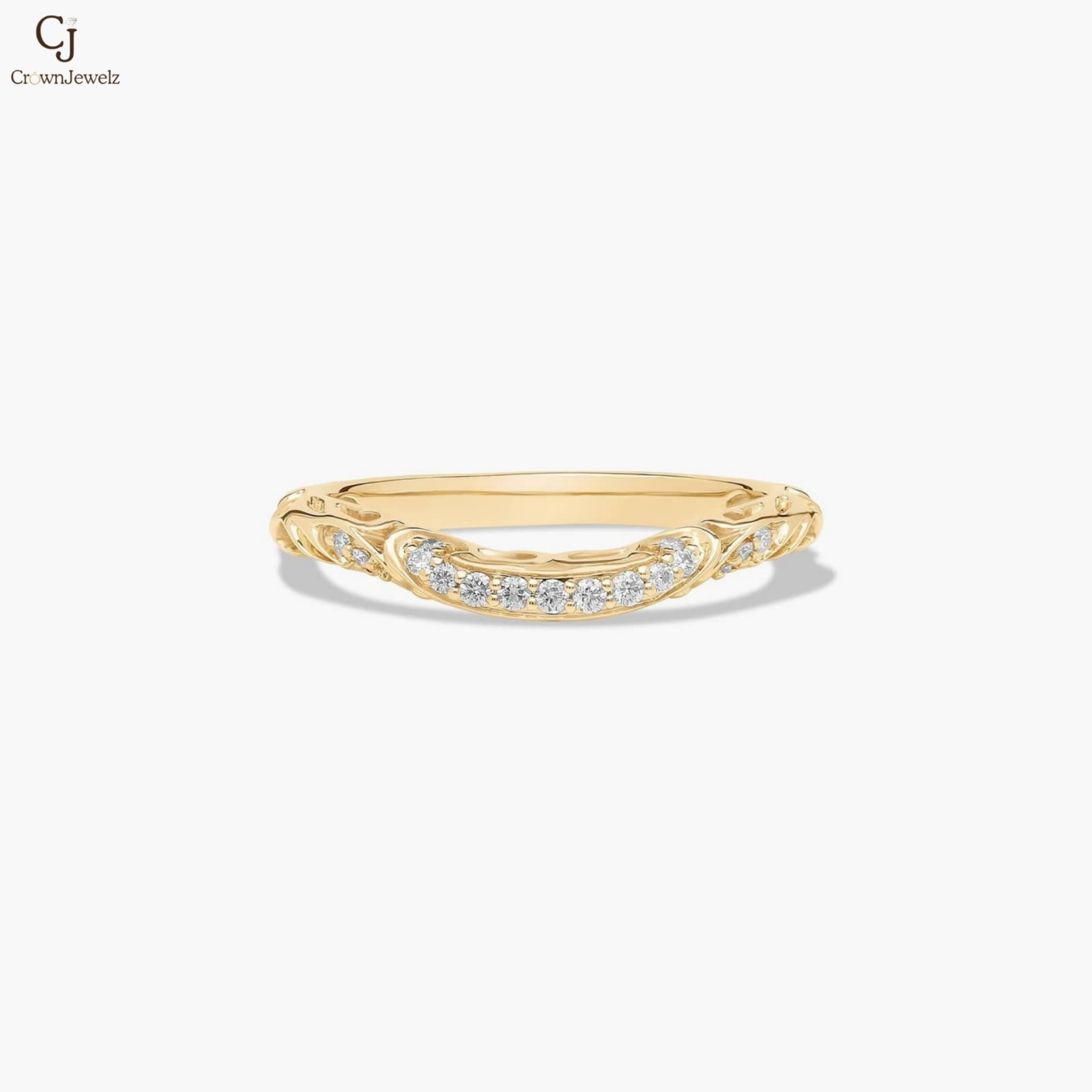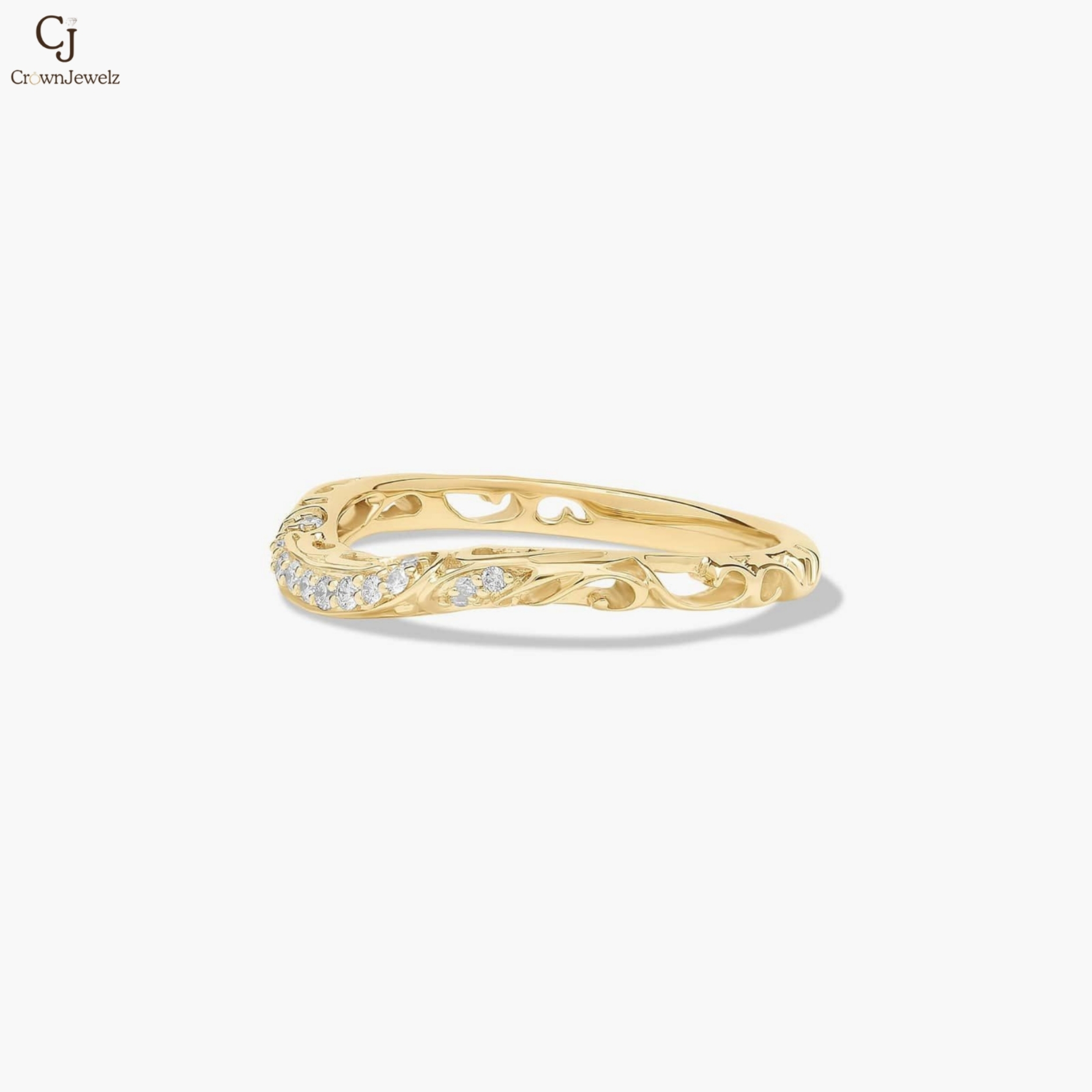 Gracefully crafted in warm yellow gold, this delicate band features flowing, vine-inspired details adorned with shimmering diamonds. The gentle curve and intricate design create a soft, romantic silhouette with subtle brilliance. Perfect for stacking or wearing alone, it adds an elegant touch of timeless charm.