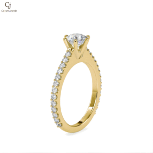 brilliant round-cut center stone secured in a classic prong setting, designed to maximize sparkle and light. The slim band is adorned with a row of meticulously set pavé diamonds, adding refined brilliance without overpowering the centerpiece. Crafted in warm rose gold, the ring offers a perfect balance of timeless sophistication and modern romance—ideal for a…