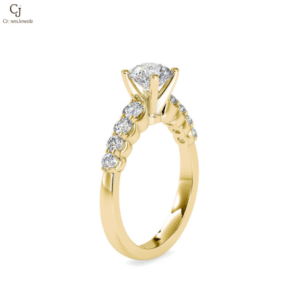 elegant ring blends vintage influence with modern polish, showcasing a round center stone framed by graceful detailing on the shoulders. The balanced proportions and refined finish evoke heirloom sophistication designed to be cherished for generations.